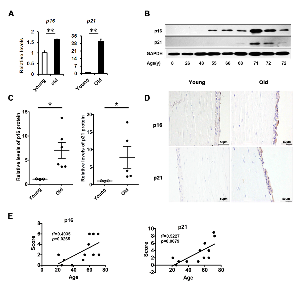 Although age-related structural and functional changes in the corneal epithelium have been documented, the mechanisms underlying them are still unknown. We inferred that corneal epithelial senescence may be a substantial part of the changes. Therefore, we tested cellular senescence in the corneal epithelium. We found that the levels of senescence-related genes in the elderly corneal epithelium, such as p16 and p21, were much higher than in the young corneal epithelium (Fig. 1A). Similarly, the protein levels of them in the elderly corneal epithelium were also elevated, as presented by western blot (Fig. 1B, C). Interestingly, we further found that p16 and p21 protein expressions increased in an age-dependent manner (r2=0.4035 and 0.5227, respectively), while elevated expressions of p16 and p21 were seen in elderly corneal epithelium (Fig. 1D, E). Our results suggest that increased cellular senescence occurs in the corneal epithelium with age.