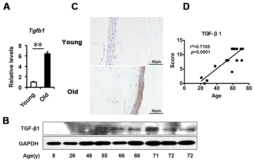 Based on the above findings in the corneal epithelium, we questioned what triggered the senescence. A large body of evidence indicates that TGF-β signaling is involved in age-related ocular disease and in cellular senescence. Therefore, we analyzed the expression of TGF-β in the corneal epithelium. We found that the transcriptional level of TGF-β1 quantified by real-time PCR was significantly increased in the elderly compared to younger corneal epithelium (Fig. 2A), as well as shown in protein levels using western blot (Fig. 2B). The TGF-β protein level detected with immunohistochemistry was also increased in an age-dependent manner (r2=0.7105), with strong staining in older corneal epithelium, but weak staining in younger ones (Fig. 2C, D). Together with the literature, these results suggest that the increased TGF-β found in the corneal epithelium with aging may correlate to the increased senescence.