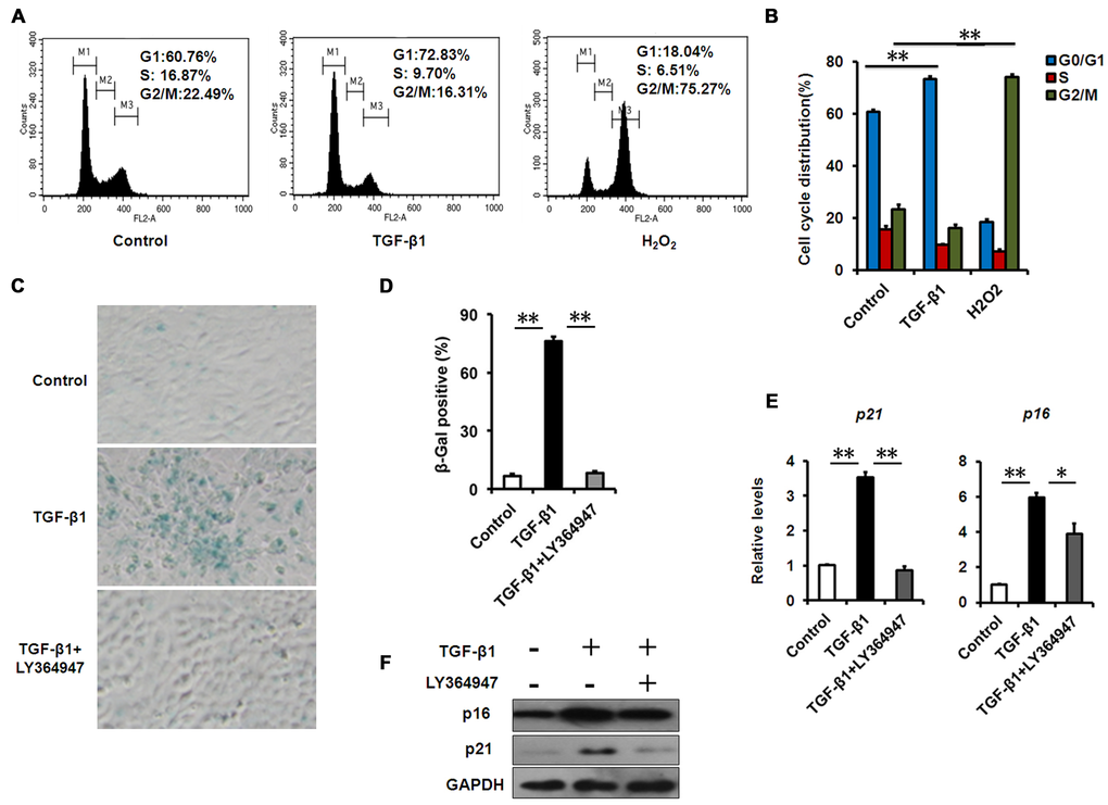 To assess the effect of TGF-β1 on corneal epithelial senescence, we used HCECs as models. Cellular senescence is defined as an irreversible arrest of mitotic cells at the G1 phase, but some cancer cells enter senescence at the G2 or S phase [24]. Cell cycle analysis by flow cytometer showed that the HCECs accumulated at G1 phase (from 60.76% to 72.83%) with a concomitant depletion of S phase cells (from 16.87% to 9.70%) after TGF-β1 exposure (Fig. 3A, B), suggesting that cell cycle arrest during HCECs senescence induced by TGF-β1 occurred at G1 phase, while H2O2 induced an obvious G2/M phase arrest. In association with the G1 arrest, we also found TGF-β1 increased the percentage of SA-β-gal–staining cells (Fig. 3C, D) and concomitantly increased the expression of p16 and p21, as analyzed by real-time PCR or western blot (Fig. 3E, F). In order to further confirm the effect of TGF-β on cellular senescence, we interrupted the TGF-β signaling pathway using a specific inhibitor, LY364947. When treated with LY364947, the percentage of SA-β-gal–staining cells was significantly decreased (Fig. 3C, D), and the levels of p21 and p16 were also downregulated (Fig. 3E, F). Taken together, these findings suggested that TGF-β1 was able to induce senescence in HCECs.