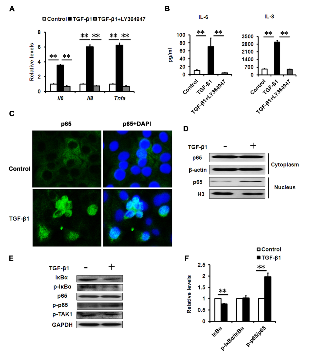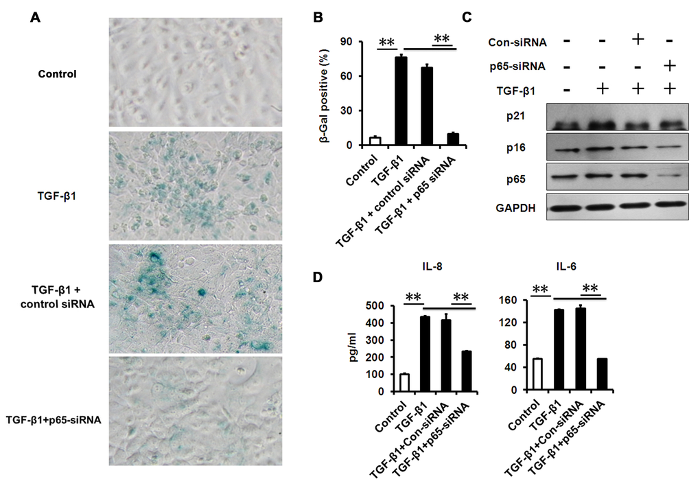 It is well-known that aged and senescent cells develop a complex SASP [25]. Further evidence demonstrates that increased production of inflammatory mediators, such as interleukin (IL)-6 and -8, during aging play a substantial role in the establishment and maintenance of the senescent phenotype [12,26]. To test whether senescence-associated inflammation happens during TGF-β1-induced cellular senescence in HCECs, we measured the expression levels of the key inflammatory mediators during cellular senescence. In TGF-β-induced senescent cells, elevated IL-6 and IL-8 gene expression (Fig. 4A) and secretion (Fig. 4B) was induced, as well as tumor necrosis factor alpha (TNFα) (Fig. 4A). More importantly, LY-364947 treatment not only rescued cells from TGF-β-induced cellular senescence, but also inhibited the expression of IL-6 and IL-8, indicating diminished senescence-associated inflammation (Fig. 4A, B). Numerous studies show that the expression of inflammatory factors, such as IL-6, IL-8 and TNFα, mainly relies on NF-κB signaling pathway. We found that NF-κB signaling was significantly activated in TGF-β-induced senescent HCECs, as evaluated by nuclear translocation of p65 using immunofluorescence and western blot (Fig. 4C, D). These results demonstrated that TGF-β signaling controls the expression of inflammatory mediators through NF-κB signaling during cellular senescence.