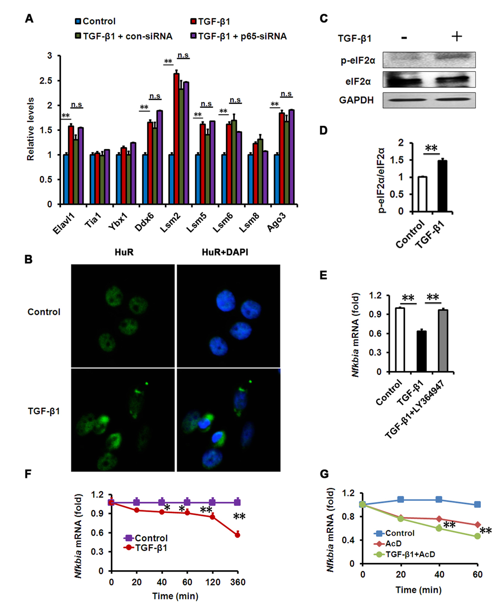 In order to explore how TGF-β could activate NF-κB in a kinase-independent manner, attention was paid to the regulation of mRNA levels. In coping with inflammatory stress, eukaryotic cells can develop a process known as an RNA stress response, characterized by RNA stress granules (SGs) and processing bodies (PBs), to control the degradation of mRNA [29,30]. In this regard, we speculated that RNA stress induced by TGF-β could be implicated in the degradation of IκBα mRNA. Therefore, we tested whether TGF-β-induced NF-κB activation in HCECs relies on this mechanism. First, we analyzed the expression of these RNA SG and PB genes in our HCEC models, and found that many of them were increased in TGF-β-treated HCECs (Fig. 5A). Consistent with this observation, we examined whether the morphology of RNA SGs could be detected in TGF-β-treated HCECs. We stained HuR, a molecular component of RNA SGs, and found that HuR-positive aggregates presented in TGF-β-treated HCECs but barely presented in untreated cells (Fig. 5B). The phosphorylation of the alpha subunit of eukaryotic translation initiation factor (eIF2α) is essential for SGs assembly [31]. We further measured the phosphorylation levels of eIF2α in HCECs treated with TGF-β, and found that it was much higher after TGF-β1 exposure (Fig. 5C, D). These data suggest that an RNA stress response could be substantial part of the TGF-β-induced inflammation in HCECs.
