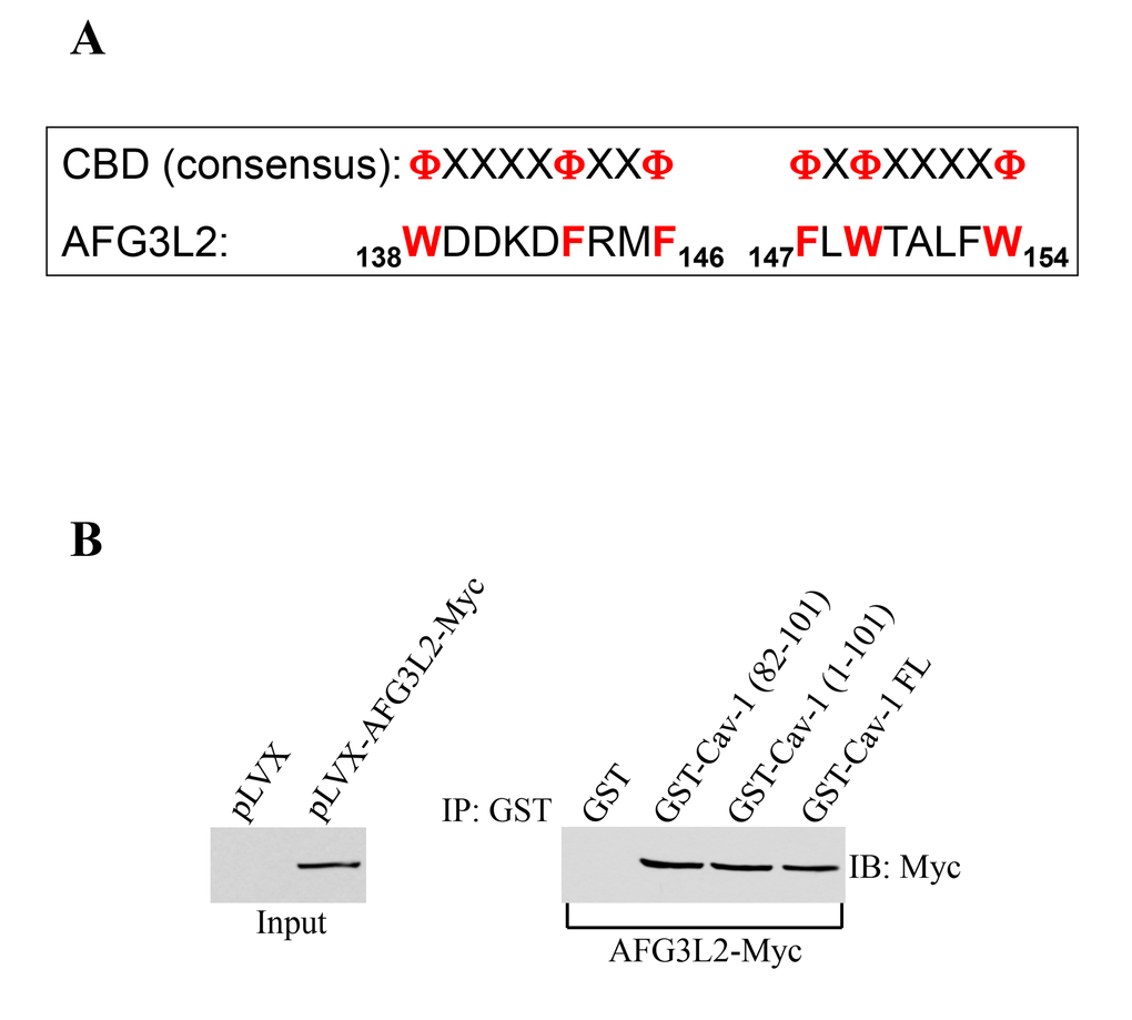 The scaffolding domain of caveolin-1 (CSD), which is represented by residues 82-101, mediates direct protein-protein interactions between caveolin-1 and a variety of signaling molecules carrying the caveolin binding domain (CBD: ΦXΦXXXXΦ, ΦXXXXΦXXΦ, or ΦXΦXXXXΦXXΦ where Φ represents an aromatic amino acid and X represents any amino acid) [38–40]. Analysis of the AFG3L2 protein sequence indicates that AFG3L2 has two putative caveolin-binding-domains between amino acids 138 and 146 and between amino acids 147 and 154 (Figure 1A). Thus, to investigate whether caveolin-1 is a binding partner of AFG3L2, we performed pull-down assays using a series of caveolin-1 deletion mutants fused to GST. Figures 1B shows that AFG3L2 was a caveolin-1-binding protein and that the scaffolding domain of caveolin-1 was sufficient for binding to AFG3L2.