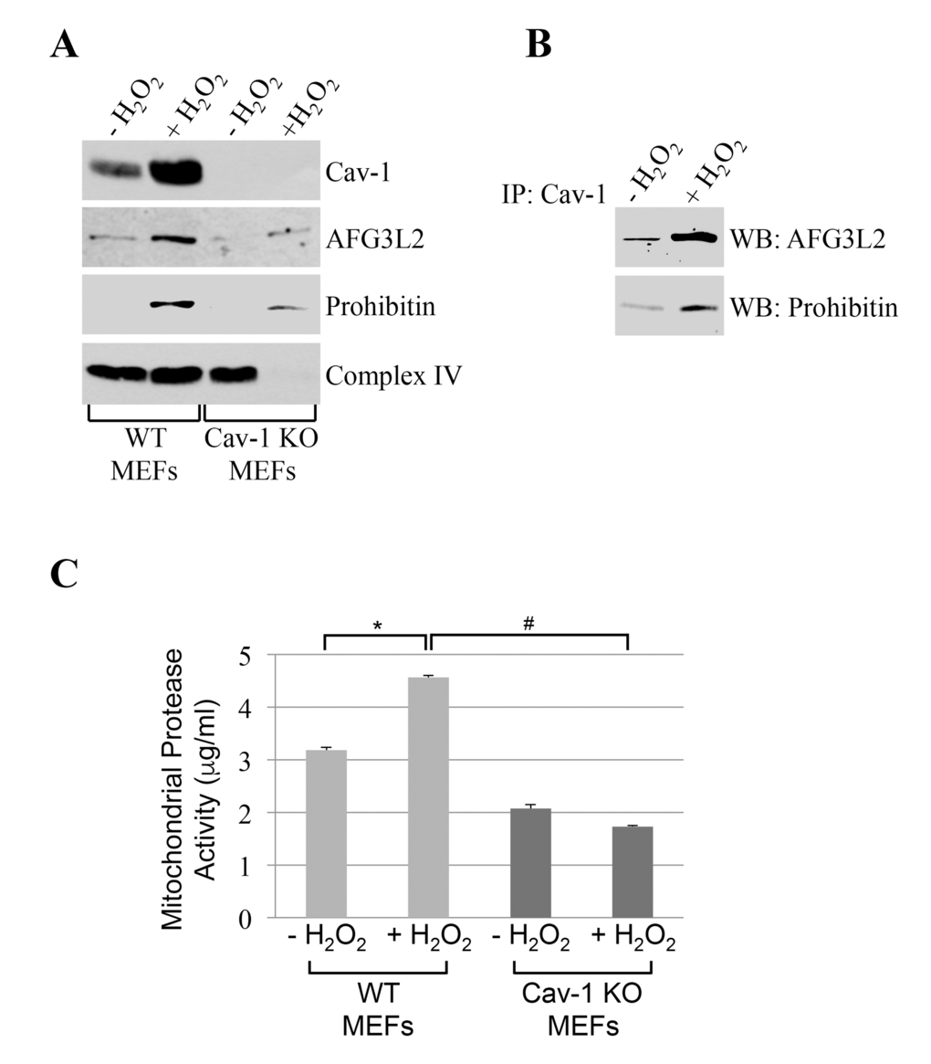 What is the functional consequence of reduced accumulation of AFG3L2 in mitochondria, after oxidative stress, in cells lacking caveolin-1? Since AFG3L2 is a major mitochondrial protease, we assessed mitochondrial protease activity in cells either expressing or lacking caveolin-1 before and after oxidative stress. We found that oxidative stress enhanced mitochondrial protease activity in wild type MEFs (Figure 2C). In contrast, oxidant stimulation failed to increase mitochondrial protease activity in cells lacking caveolin-1 (Figure 2C), in which AFG3L2 did not accumulate in mitochondria (Figure 2A).