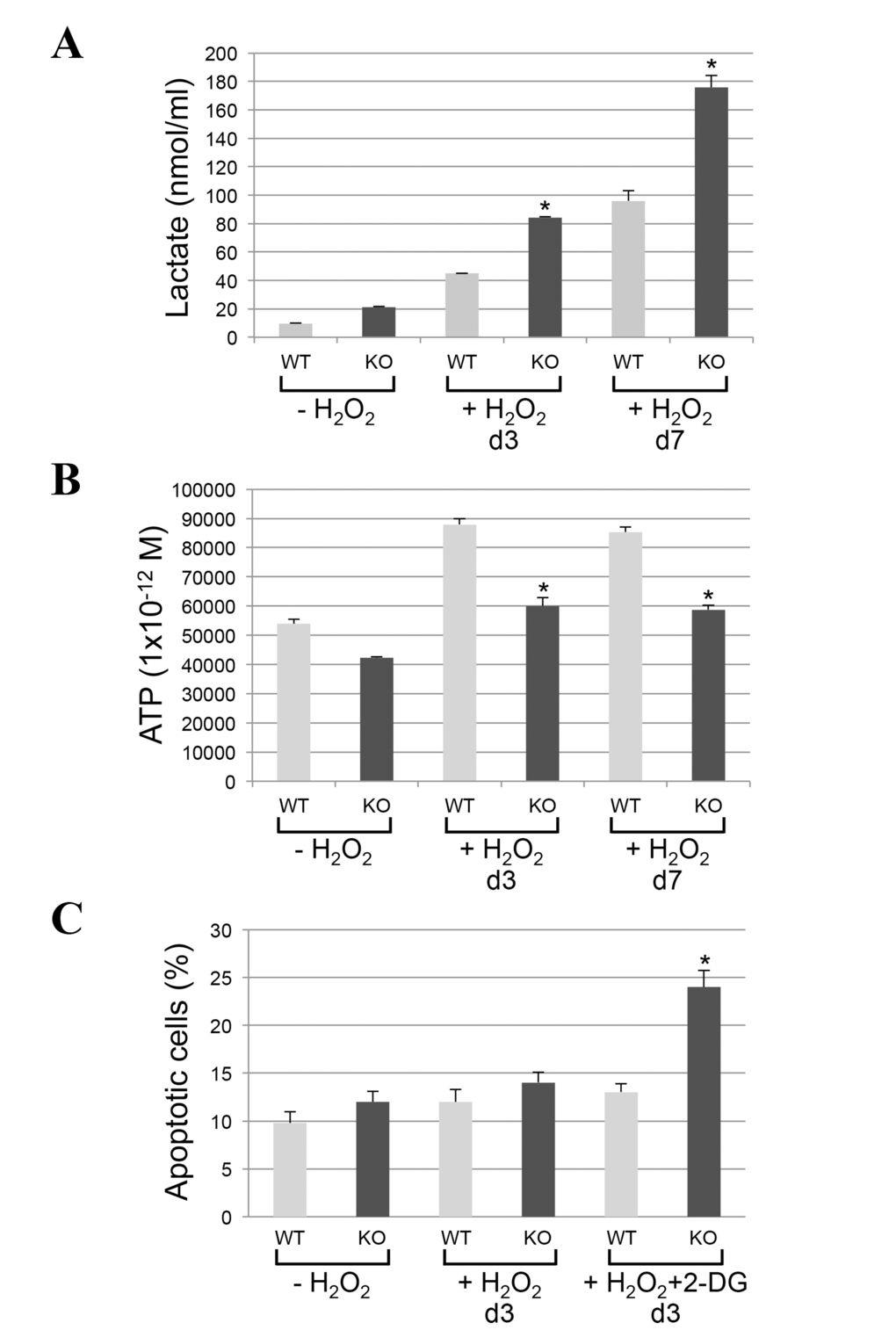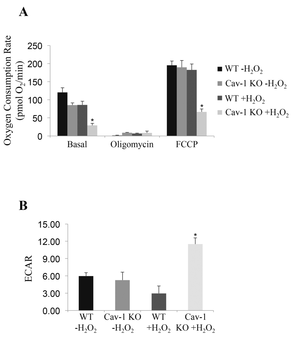 Mitochondrial proteases regulate mitochondrial protein quality control. Since impaired mitochondrial protease activity has been associated with mitochondrial respiratory defects and we found that AFG3L2 does not accumulate in mitochondria in caveolin-1 null cells after oxidative stress, we asked whether a lack of caveolin-1 leads to bioenergetic dysfunctions. Bioenergetic profile of wild type and caveolin-1 null MEFs, under resting conditions and after sublethal oxidative stress, was determined using the Seahorse Metabolic Analyzer, which simultaneously measures oxygen consumption rate (OCR) and extracellular acidification rate (ECAR). OCR is an indicator of mitochondrial respiration while ECAR is predominantly the result of glycolysis. We found that both the basal and maximal oxygen consumption rates were dramatically inhibited only in caveolin-1 null MEFs after oxidative stress (Figure 3A). In addition, our data show that ECAR was significantly elevated only in caveolin-1 null cells following oxidant stimulation (Figure 3B). Consistent with these data, we show that lactate production, a direct indication of glycolysis, is significantly higher in caveolin-1 null MEFs, as compared to wild type MEFs, after oxidative stress (Figure 4A). Since the number of ATP molecules produced through glycolysis is lower than that produced through oxidative phosphorylation, one would expect reduced ATP production in cells lacking caveolin-1. Consistent with this prediction, we show in Figure 4B that production of ATP is inhibited in caveolin-1 null MEFs, as compared to wild type cells. Together, these data indicate that a lack of caveolin-1 promotes an oxidative phosphorylation to glycolysis metabolic switch under conditions of oxidative stress. Finally, since a switch from oxidative phosphorylation to glycolysis makes cells more sensitive to glucose deprivation, we assessed the dependence from glucose of wild type and caveolin-1 null MEFs after oxidative stress. To this end, cells were treated with 2-deoxy-D-glucose, a glucose molecule that does not undergo glycolysis and mimics glucose deprivation. We show in Figure 4C that the percentage of apoptotic cells was significantly higher when caveolin-1 null MEFs where subjected to oxidant stimulation in the presence of 2-deoxy-D-glucose, as compared to wild type MEFs.