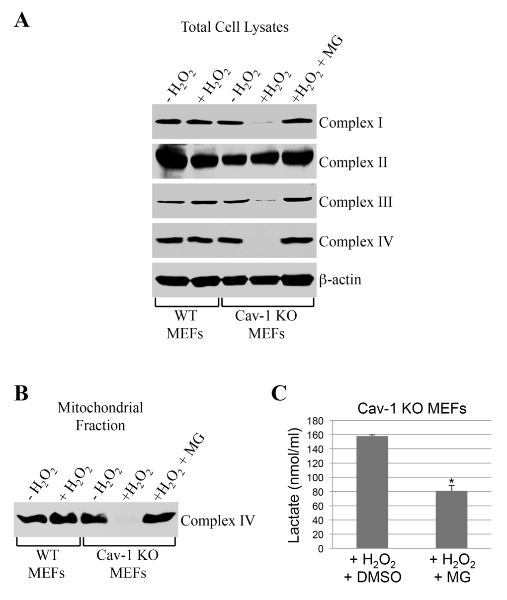 The proteasome is a cytosolic machinery that mediates the degradation of a variety of proteins, including those of cytosolic, endoplasmic reticulum and mitochondrial outer membrane origin. Less is known about the proteasome-mediated degradation of mitochondrial inner membrane proteins. MG-132 is a specific and potent proteasome inhibitor. Our results show that treatment with MG-132 rescues the degradation of mitochondrial respiratory chain proteins in caveolin-1 null MEFs after oxidative stress. We envision a scenario in which the loss of protein quality control in oxidant-stimulated and caveolin-1-lacking cells, due to the inability of m-AAA to localize to mitochondria in the absence of caveolin-1, prevents the homeostatic elimination of respiratory chain proteins that are damaged by oxidative stress. As such, the overall assembly of respiratory chain complexes is destabilized, similarly to what reported in animal models and humans lacking m-AAA expression. As a consequence, respiratory chain proteins are either transported into the cytoplasm to be degraded by the proteasome or made available to the proteasome machinery while still in the mitochondria. In support of this scenario, there is evidence showing that mitochondrial uncoupling protein 2 (UCP2), a mitochondrial inner membrane protein, is degraded by the cytosolic 26S proteasome.
