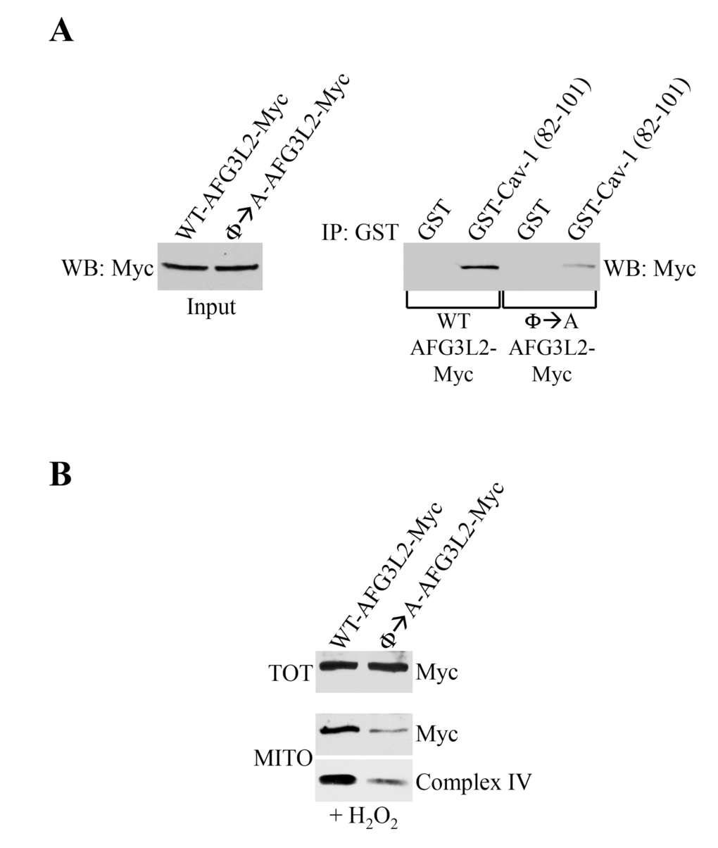 Our data show that AFG3L2 accumulates in mitochondria under conditions of sublethal oxidative stress, where AFG3L2 interacts with caveolin-1. Our findings also demonstrate that AFG3L2 fails to localize to mitochondria and respiratory chain complexes are degraded in caveolin-1-lacking cells. To prove a causal link between a lack of caveolin-1-mediated mitochondrial localization of AFG3L2 and degradation of respiratory chain complexes, we generated a mutant form of AFG3L2 (Φ→A-AFG3L2) in which the aromatic residues within the caveolin-1-binding domain were substituted with alanines (Figure 1A). We find that the interaction between Φ→A-AFG3L2 and caveolin-1 was dramatically compromised, as compared to wild type AFG3L2 (WT-AFG3L2) (Figure 7A). We then expressed either WT-AFG3L2 or Φ→A-AFG3L2 in wild type MEFs and evaluated their mitochondrial localization after oxidative stress. We show in Figure 7B that the accumulation of Φ→A-AFG3L2 in mitochondria, in contrast to WT-AFG3L2, was significantly reduced. In addition, the reduced mitochondrial localization of Φ→A-AFG3L2 resulted in degradation of complex IV after oxidative stress (Figure 7B). These findings causally link the absence of caveolin-1-mediated targeting of AFG3L2 to mitochondria in caveolin-1 null MEFs with respiratory chain protein degradation. These data are also consistent with the notion that, in the absence of mitochondrial m-AAA activity, mitochondrial protein quality control of ROS-damaged proteins is prevented, leading to mitochondrial protein degradation [6,8–12].