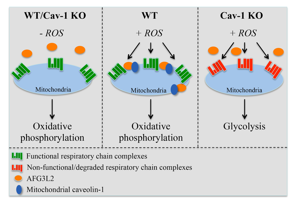 Interestingly, transmission electron microscopy showed that caveolae establish contacts with mitochondria [34]. In addition, caveolin-1 immunogold electron microscopy demonstrated that caveolin-1 partially localizes to mitochondria [35]. In support of these findings, mitochondrial proteins were identified in purified caveolae by proteomic analysis [36] and caveolin was found in mitochondria by immunofluorescence and immunoblotting analysis [34,35,37]. Thus, caveolin-1 may have an underappreciated role as a regulator of mitochondrial functions. Since oxidative stress upregulates caveolin-1 protein expression and given the notion that mitochondria possess quality control systems to avoid oxidant-induced damage, we investigated the hypothesis that caveolin-1-mediated signaling is activated under conditions of oxidative stress to maintain mitochondrial function. We found that caveolin-1 is a novel endogenous binding partner of AFG3L2. We show that caveolin-1 promotes the localization of AFG3L2 to mitochondria after oxidative stress, where AFG3L2 maintains mitochondrial function by providing mitochondrial protein quality control. In the absence of caveolin-1 expression, AFG3L2 fails to move to mitochondria upon oxidant stimulation. As a consequence, a lack of mitochondrial protein quality control leads to degradation of mitochondrial respiratory chain complexes and a switch from oxidative phosphorylation to glycolysis. Together, our data provide novel mechanistic insights into how cells prevent bioenergetic dysfunctions when exposed to oxidative stress.