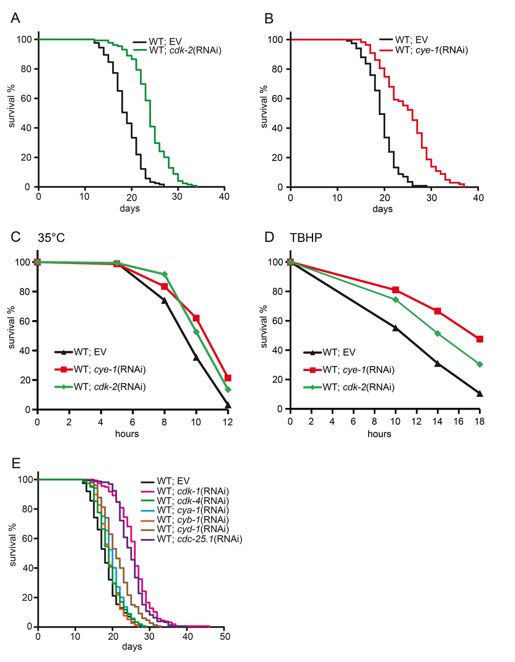 Many C. elegans mutations and manipulations that increase lifespan also confer resistance towards diverse forms of stress [31]. We analyzed heat and oxidative stress response of cye-1 and cdk-2 deficient worms. Knockdown of cye-1 and cdk-2 by RNAi enhanced tolerance to thermal stress (Figure 1C) and oxidative stress (Figure 1D) compared to wild type control.
