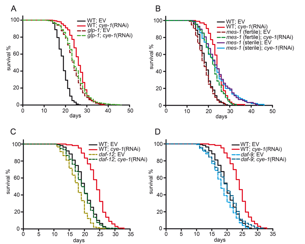 The longevity of animals lacking the germline depends on steroid hormone signaling pathways. Mutations in the nuclear hormone receptor daf-12 prevent the lifespan-extending effect when germline stem cells are removed [1,10,37]. To test whether cye-1 genetically interacts with daf-12 to regulate lifespan, we examined the effect of cye-1 knockdown in the daf-12(rh61rh411) null mutant. We found that daf-12(rh61rh411);cye-1(RNAi) animals have significantly shortened lifespans compared with cye-1(RNAi) (Figure 2C and Table 1). Enzymes that produce DAF-12 ligands, such as the cytochrome P450 DAF-9 also contribute to steroid hormone signaling and mutation of daf-9 abrogates the longevity of germline-less animals [13,37]. The loss of function mutant daf-9(rh50) displays a slightly reduced lifespan, presumably because DAF-12 is not fully activated [37]. We observed that the lifespan extension of cye-1(RNAi) was strongly suppressed in the daf-9 mutant background (Figure 2D and Table 1). Together, these observations suggest that cye-1 exerts its effect on lifespan through the steroid hormone signaling pathway including DAF-9 and the nuclear hormone receptor DAF-12.