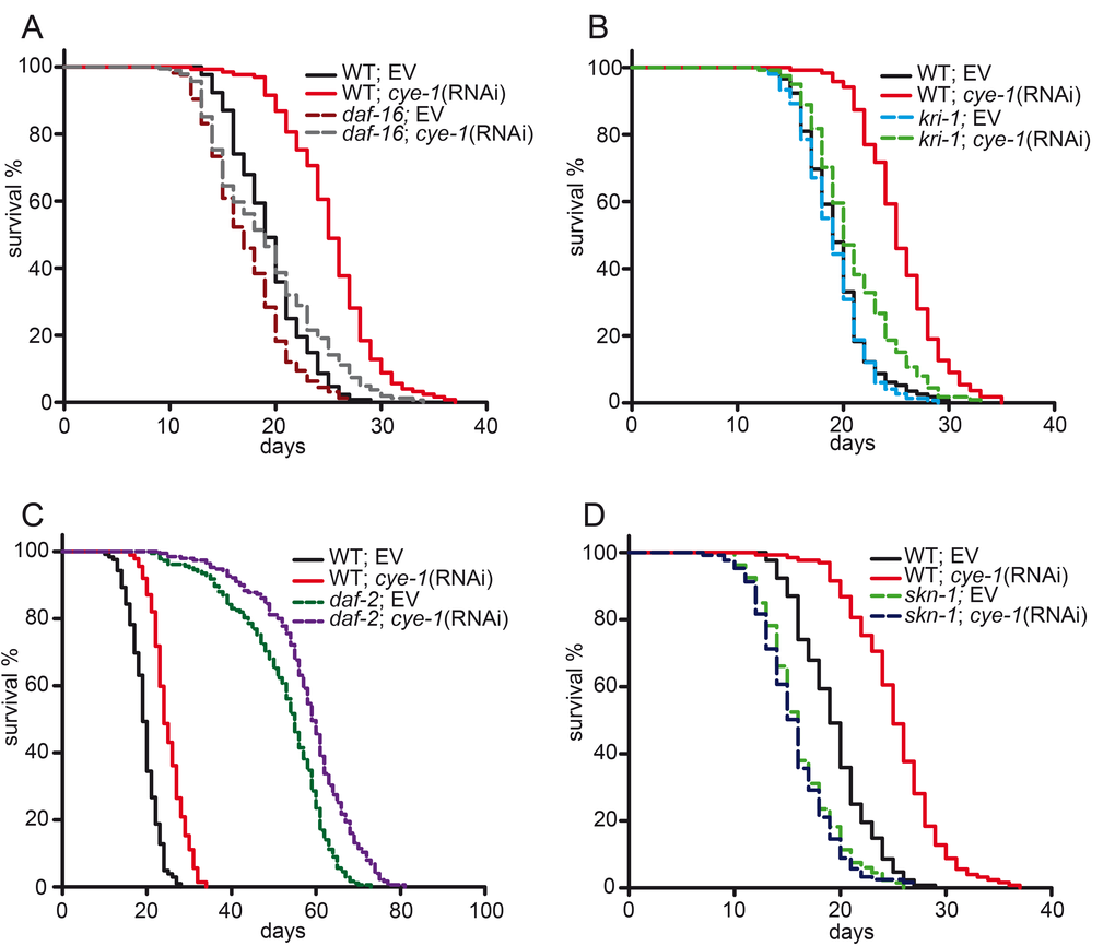 The ankyrin-repeat protein KRI-1/KRIT1 is needed for loss of the germline to target DAF-16 to the nucleus and extend lifespan [10]. Next, we investigated if kri-1 is also required for the longevity of cell cycle deficient worms. We observed that the longevity associated with cye-1(RNAi) and cdk-2(RNAi) was strongly suppressed by lack of kri-1, shortening mean lifespan by up to 18% (Figure 3B and S2E, Tables 1 and S2).