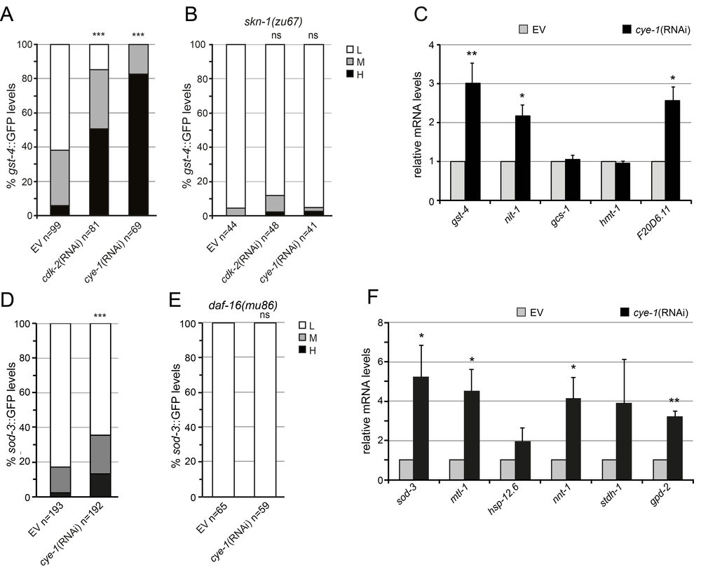 We next analyzed effects on endogenous SKN-1–regulated gene expression in adult worms after inhibition of cye-1 through RNAi. Here, we focused on cye-1 representative for different cell cycle factors. We used quantitative PCR to analyze the mRNA levels of a set of well characterized SKN-1 targets involved in various stress processes like glutathione S-transferase gst-4, γ-glutamyl cysteine synthetase gcs-1, oxidoreductase F20D6.11, nitrilase nit-1, and ABC transporter hmt-1 [42,43]. mRNA production of gst-4 and nit-1 has also been shown to depend on SKN-1 under normal (unstressed) conditions, while gcs-1, hmt-1, and F20D6.11 are upregulated by SKN-1 in response to stress [42]. We observed that RNAi knockdown of cye-1 increased the expression of several endogenous SKN-1 target genes in adult worms (Figure 4C). We conclude that inhibition of cell cycle factors promotes the transcriptional activity of SKN-1 for detoxification and stress defense.