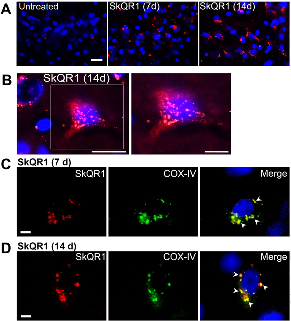 We first assessed the localization of SkQ1 in the brain, using a rhodamine derivative of SkQ1, 10(6′-plastoquinonyl) decylrhodamine 19 (SkQR1), which, as shown elsewhere [11,14], also has neuroprotective properties. We found high-intensity fluorescent signals of SkQR1 in the brain neurons of OXYS rats treated with this antioxidant for 7 or 14 days (n=4). Depending on duration of administration, the signal of SkQR1 increased (7 day < 14 days) and was most noticeable in neurons of the hippocampus (Fig. 1A–D), cortex (Fig. S1A), thalamus, myelencephalon, and cerebellum (Fig. S1B) of OXYS rats, suggesting that SkQ1 accumulates in cerebral neurons. Moreover, using the antibody to COX-IV (cytochrome c oxidase subunit 4, mitochondrial loading control), we found that SkQR1 is localized to neuronal mitochondria (Fig. 1C and D), suggesting that this antioxidant may play an important neuroprotective role by regulating and restoring the mitochondrial function.