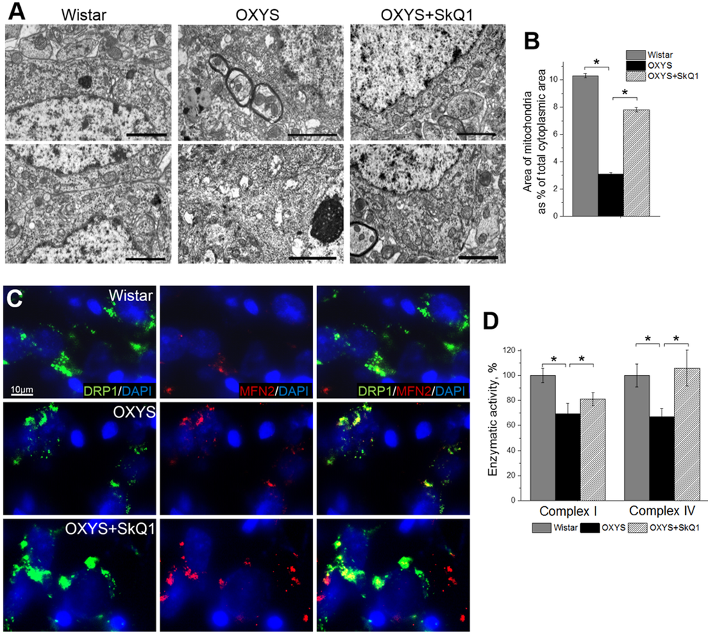 In the hippocampus, we found increased expression of Drp1 and Mfn2 in SkQ1-treated OXYS rats and Wistar rats compared to untreated OXYS rats (Fig. 2C); this result was suggestive of improvement of the mitochondria biogenesis processes in OXYS rats by SkQ1. Finally, using Microplate Assay Kits we found that enzymatic activity of complexes I and IV in the hippocampus of untreated OXYS rats was ~30% lower than that in Wistar rats. Less pronounced interstrain differences in these parameters compared to the scale of detected by electron microscopy mitochondrial destructions, we can assume methodological reasons. The enzymatic activity of the respiratory chain complexes was determined in the isolated mitochondria, in which severely damaged mitochondria do not fall. Administration of SkQ1 slightly but not significantly increased enzymatic activity of complex I and significantly increased enzymatic activity of complex IV in OXYS rats to the level of Wistar rats (Fig. 2D). Taken together, these findings indicate that the mitochondrial alterations involved in progression of AD-like pathology in OXYS rats can be significantly attenuated by SkQ1-driven improvement of mitochondrial function.