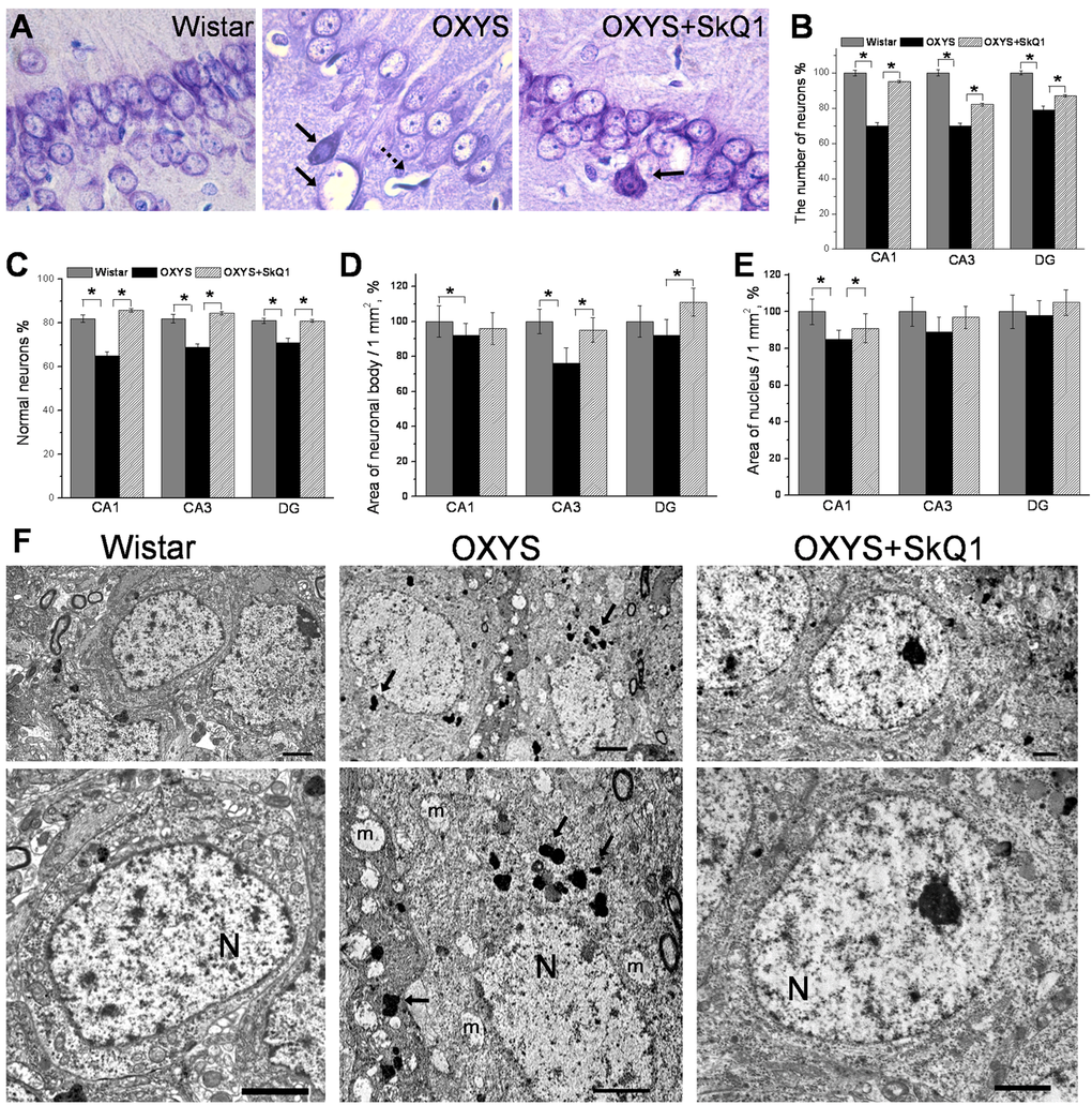Besides, in SkQ1-treated OXYS rats, the area of the nuclei in the СА1 region was larger than that in untreated OXYS rats and was not different from this parameter in Wistar rats (Fig. 3E). Further analyses of the ultrastructural state of pyramidal neurons in the hippocampal СА1 region of the rats revealed significant changes (similar to those showed recently [31]) in the structural organization of the nucleus, nucleolus, Golgi complex, endoplasmic reticulum (Fig. 3F) and mitochondria (Fig. 2B) in OXYS rats compared to the Wistar strain. In addition, in many neurons of OXYS rats, there were numerous vacuoles and phagolysosomes of various sizes and shapes (Fig. 3F). Administration of SkQ1 substantially improved the ultrastructural state of neurons in OXYS rats (Fig. 3F) and according to morphometric analysis, significantly increased specific area of mitochondria (Fig. 2B) and the endoplasmic reticulum, decreased specific area of lysosomes and vacuoles, and slightly but not significantly decreased the specific area of the Golgi complex (Table S1). These data corroborate previous reports of neuronal loss and neurodegenerative changes in the hippocampus of OXYS rats at this age [31] and indicate that SkQ1 treatment prevented the neuronal loss and progression of neurodegeneration in these rats.
