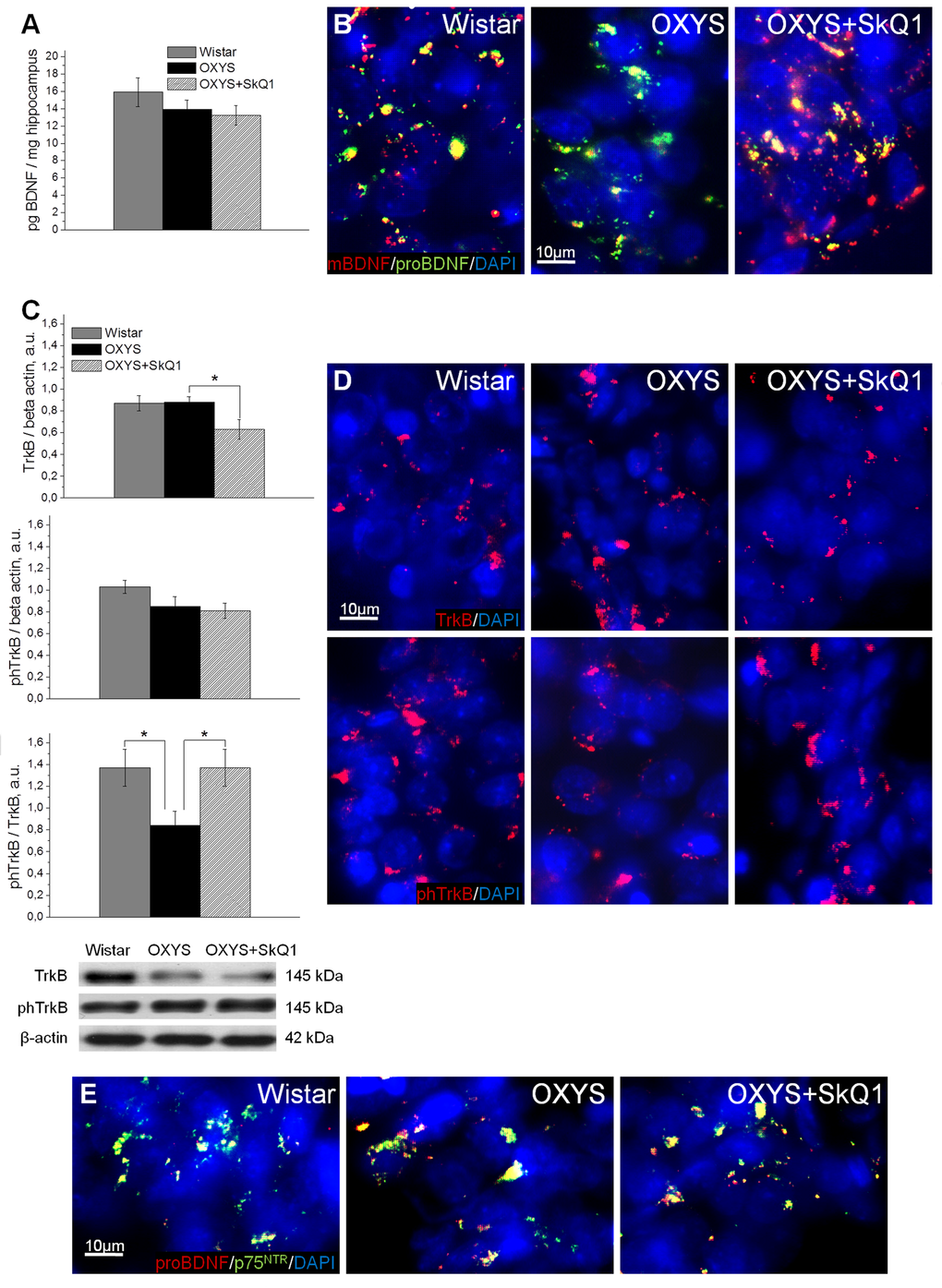 We next assessed the effects of SkQ1 treatment on the levels of brain-derived neurotrophic factor (BDNF) and of neurotrophic receptors tyrosine kinase B (TrkB) and p75 neurotrophin receptor (p75NTR), because we recently reported [32] that in OXYS rats, the cerebral level of BDNF compensatory increases in response to the development of neurodegenerative changes at early stages of AD-like pathology and dramatically decreases with age. Enzyme immunoassay analysis of BDNF (Fig. 4A) revealed no significant differences in protein levels of total BDNF between OXYS rats and Wistar rats. In addition, we found no effects of SkQ1 treatment on the BDNF protein level in OXYS rats. After that, we immunolabeled tissue samples with antibodies against the mature form of BDNF (mBDNF) and immature BDNF (proBDNF) to assess the contribution of each protein form to the total BDNF protein level in untreated or chronically SkQ1-treated OXYS rats and in Wistar rats (Fig. 4B). In the hippocampus, we found decreased mBDNF and increased proBDNF concentrations in OXYS rats and no differences in these proteins’ levels between SkQ1-treated OXYS rats and Wistar rats. Therefore, the downregulation of mBDNF and upregulation of proBDNF in OXYS rats is indicative of a shift in the proBDNF/mBDNF balance in the direction of the immature form of the protein (proBDNF), which activates apoptosis.