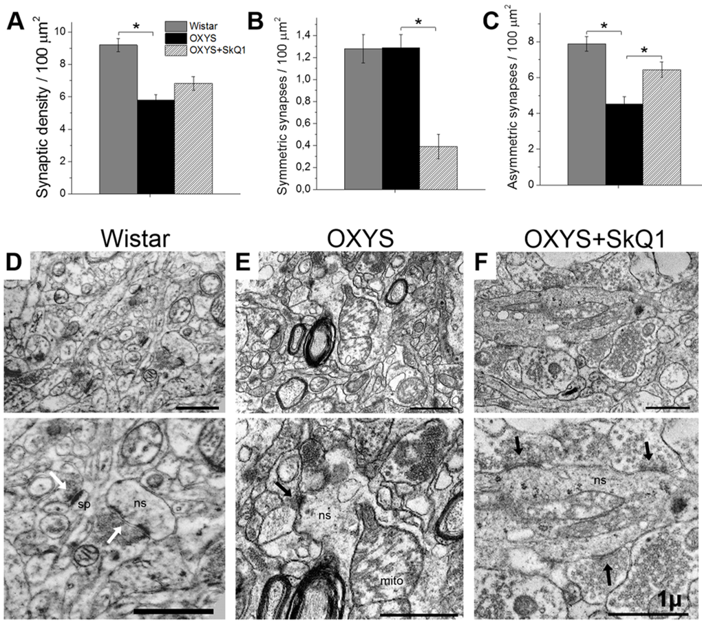 In line with their hippocampus-dependent cognitive deficits, OXYS rats show a synaptic loss [31], prominent alterations of synaptic functions [33], and significant ultrastructural changes [28] in the hippocampus. Ultrastructural abnormalities in synaptic terminals of OXYS rats in the period of progression of AD-like pathology are characterized by decreased numbers of synaptic vesicles, by signs of their disorganization and destruction, by increased numbers of various vacuoles, and by swelling and disintegration of mitochondria [31]. To determine whether chronic SkQ1 treatment alleviates synaptic deficits in OXYS rats, we measured SkQ1’s effects on synaptic density in the CA1 region of the hippocampus. Electron-microscopic analysis showed that the synaptic density was significantly lower in OXYS rats (Fig. 5A) than in Wistar rats. Furthermore, the number of asymmetric (excitatory) synapses (classified by morphometric criteria) was almost twofold lower in OXYS rats (Fig. 5C) than in Wistar rats. In SkQ1-treated OXYS rats, the synaptic density was 17% higher (Fig. 5A) than that in untreated OXYS rats (insignificantly). In contrast, the number of excitatory synapses in SkQ1-treated OXYS rats was 42% greater (Fig. 5C) than that in untreated OXYS rats. The proportion of symmetric (inhibitory) synapses classified by morphometric criteria was twofold smaller in the SkQ1-treated OXYS rats than in untreated OXYS rats (Fig. 5B). In contrast to Wistar rats (Fig. 5D) and SkQ1-treated OXYS rats (Fig. 5F), in untreated OXYS rats, we observed degenerating synaptic terminals substantially more frequently (Fig. 5E); they showed characteristic clarification and swelling of the cytoplasm, disintegration of synaptic vesicles, an increase in the number of various vacuoles, and swelling and disintegration of mitochondria.