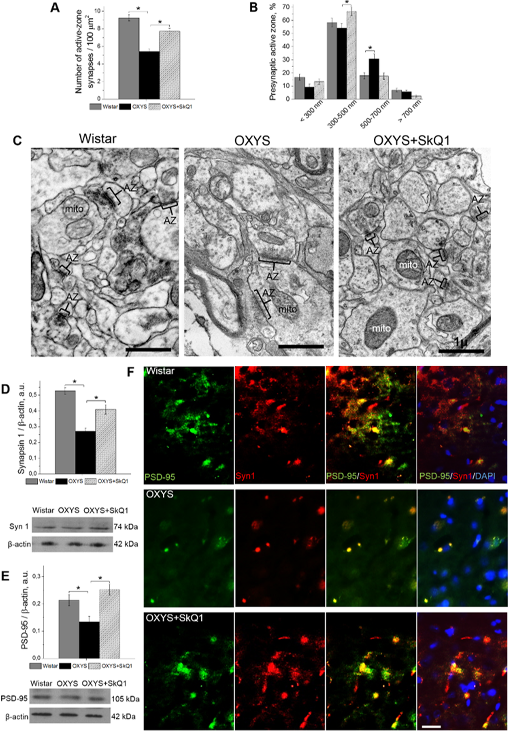 The conclusions of the morphometric assessment of the synaptic status were confirmed by the results of evaluation of SkQ1’s influence on the hippocampal amounts of protein markers of pre- and postsynaptic density: synapsin I, participating in the regulation of the process of neurotransmitter release in synapses, and postsynaptic density protein 95 (PSD-95): the main protein of postsynaptic density. According to western blot analysis, the hippocampal level of both proteins in untreated OXYS rats was significantly lower (Fig. 6D, E) than that in Wistar rats. Prolonged administration of SkQ1 significantly increased the levels of synapsin I and PSD-95 in the hippocampus of OXYS rats (Fig. 6D, E), to the level of the Wistar strain. Finally, we immunolabeled tissue samples with anti-synapsin I and anti-PSD-95 antibodies to assess the effects of SkQ1 treatment on expression of the proteins (Fig. 6F). In the hippocampus, we observed decreased levels of synapsin I and PSD-95 in OXYS rats and no differences in these proteins’ levels between SkQ1-treated OXYS rats and Wistar rats. Thus, these results indicate that chronic SkQ1 treatment probably not only ensured integrity of the existing neuronal connections but also promoted formation of new functionally active neuronal relations.