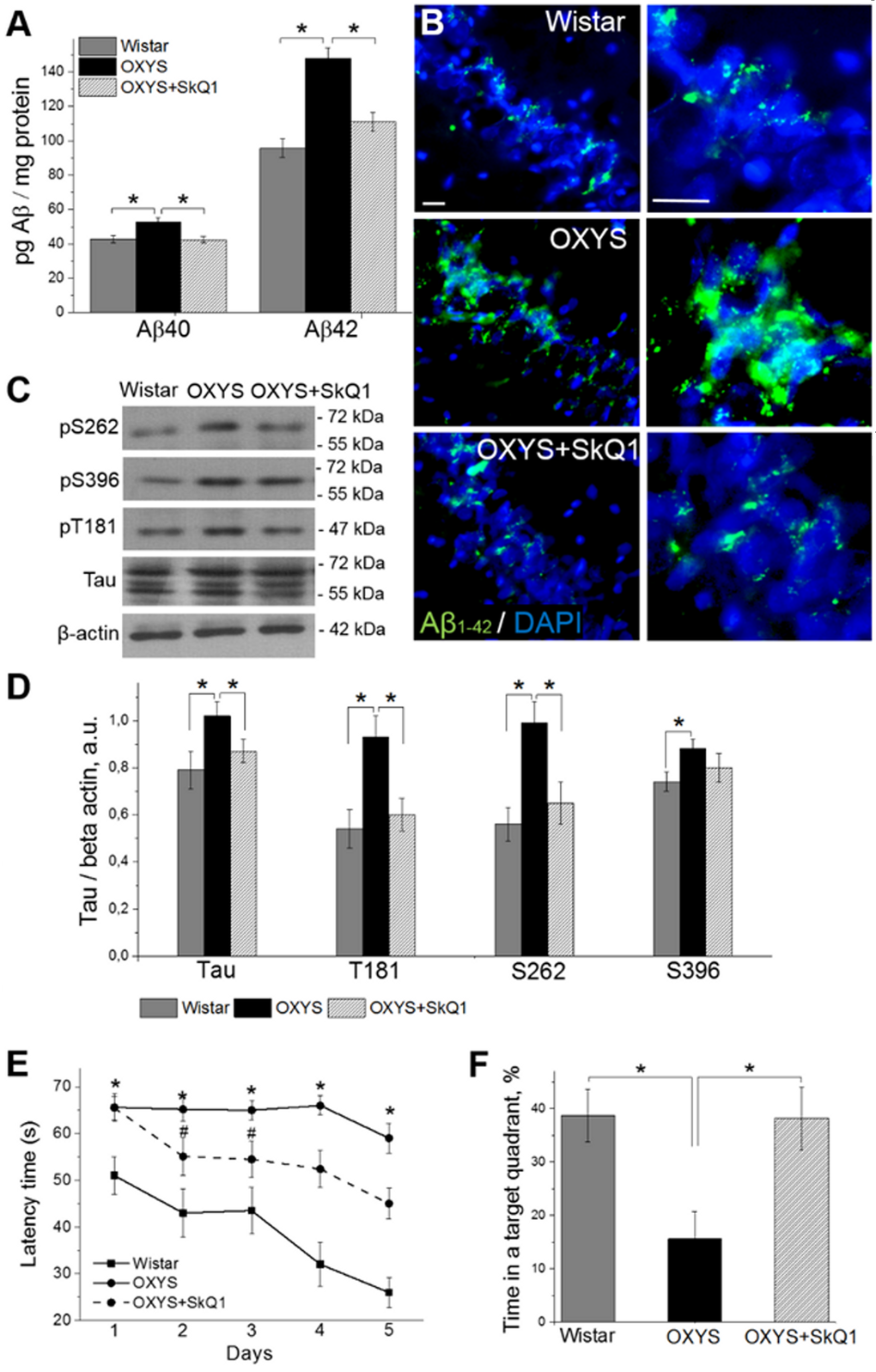 Because the levels of tau protein and of its phosphorylated form are increased in the brain of OXYS rats already at age 3 months [28], we then evaluated the ability of SkQ1 to slow down the hyperphosphorylation of tau protein in the hippocampus during progression of AD-like pathology. Western blot analysis of Tau and of its phosphorylated forms pТ181, pS262, and pS396 (Fig. 7C, D) revealed significantly increased protein levels of all of the above in 18-month-old OXYS rats compared to Wistar rats. SkQ1 significantly lowered the protein expression of Tau, pТ181, and pS262 in OXYS rats, to the level of Wistar rats (Fig. 7C, D).