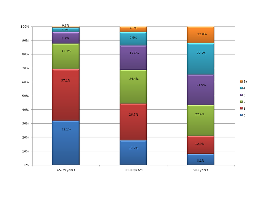 In more than two-thirds of the examined senior respondents at least one geriatric problem was revealed; while, more than one-third manifested two or more geriatric deficits; none of respondents had all eight impairments. On the other hand, 32% of those aged 65-79 years, almost 18% of those aged 80-89 years and 8% of the oldest olds had no geriatric condition assessed in this study. While among those younger than 90 years of age the majority of studied respondents presented one geriatric disability, in those aged 90 years and more, those with two and four geriatric problems prevailed (Figure 1).