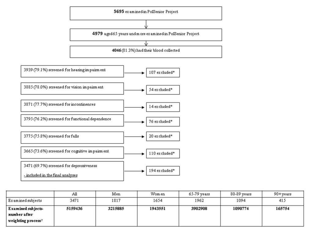 The study was conducted on 5695 subjects participating in the PolSenior Project, who had been randomly selected from 16 administrative regions of Poland by three-stage, proportional, and stratified –by age group selection process, as described elsewhere [9]. In brief, stratified random sampling was used with the aim of recruiting old men and women and putting them into six age-groups spanning five years each: 65–69, 70–74, 75–79, 80–84, 85–89, and 90 years and over, and also those of 55-59 years of age, as a comparative sample. The youngest cohort (55-59 years old, 716 respondents) was not included in the present analysis. Old adults (4797 probates) were answering an interviewer-administered questionnaire, had blood and urine sampling taken whenever feasible. All procedures were performed by pre-trained nurses.The study fully complied with all applicable institutional and governmental regulations concerning the ethical use of human volunteers and with the terms of the Helsinki Declaration. The institutional review board approved the study protocol (the Bioethics Committee of the Medical University of Silesia in Katowice, Poland; number: KNW-6501-38/I/08) and all the recruited subjects gave their written informed consent.