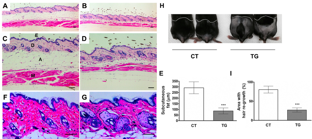 Tamoxifen-injected COX2 transgenic mice appeared normal until the age of 20 weeks, when we first noticed an unkempt and greasy hair coat (Fig.1C). Reduced subcutaneous fat is one of the markers for aged skin [26]. The analysis of H&E-stained sections of skin revealed a reduction in the subcutaneous fat in 20-week-old COX2 transgenic mice when compared to the skin in tamoxifen-injected control littermates (Fig. 2A-E, n=12). Additionally, hyperplasia of the sebaceous gland (Fig. 2F and G) was observed in COX2 transgenic skin, as is also observed in aged human skin [27,28] and in the skin of XPD mutant mice, which exhibit premature aging phenotypes [29]. Hair re-growth also declines as a function of age in mice [30] and is reduced in other mouse models of aging [26,31]. Thus, a hair re-growth assay was performed to investigate the impact of COX2 on hair growth. In mouse skin, coordinated hair regeneration occurs in a wave-like pattern across the skin surface. However, in old mice, waves of hair growth slow down, or hair cycle domains fragment into smaller domains, resulting in patchy hair growth [32]. As shown in Fig. 2H and I, delayed or patchy re-growth of hair was observed in all COX2 transgenic mice, whereas the age-matched control mice exhibited normal hair re-growth 20 days after removal of hairs.