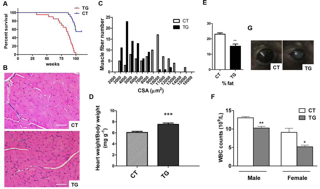 Tamoxifen-induced COX2 transgenic mice exhibited other signs of aging. The lifespan of COX2 transgenic mice was significantly reduced compared to that of control mice (Fig 3A). Studies have shown that there is a reduction in muscle fiber size with increasing age [33]. As shown in Fig. 3B and C, the size of the muscle fiber in the hind leg of COX2 transgenic mice was reduced compared to that in control littermates (n=5). Increase in heart weight is normally found in the aging human heart [34,35]. The heart weight relative to body weight was increased in COX2 transgenic mice (Fig. 3D, n=9) compared to that in control littermates. We also performed quantitative assessments of body composition with X-ray densitometry of the whole mouse. The fat content was reduced in COX2 transgenic mice compared to control littermates, consistent with histological analysis of subcutaneous fat (Fig. 3E, n=5). However, bone mineral density was not significantly different between control and transgenic littermates (data not shown). COX2 transgenic mice also exhibited changes in peripheral blood composition. Total blood cell counts in 25-week-old transgenic and control mice show no differences in the number of red blood cells (data not shown). However, white blood cell counts in transgenic animals were significantly lower than those in control littermates (Fig. 3F). In addition, some COX2 transgenic mice developed ocular abnormalities such as opaque eyes and blindness (Fig. 3G).