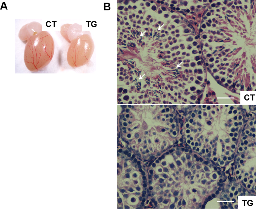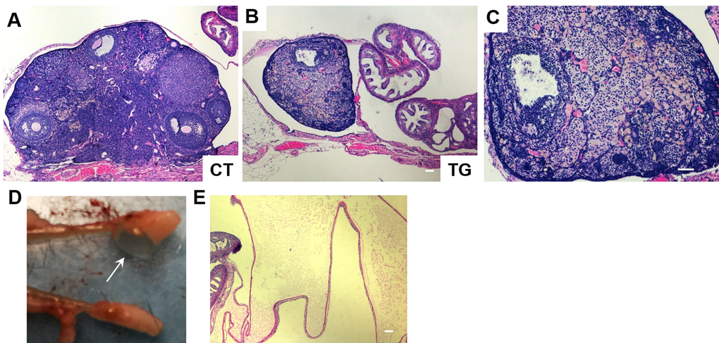 Female fertility decreases with age, and males develop an age-associated decline in sperm count [36]. We set up matings between 10 COX2 transgenic males (12 ~ 23 weeks old) and 10 wild-type females. However, none of the wild type females became pregnant after two months of being housed together. Testes of the COX2 transgenic males were generally smaller than wild-type testes (Fig. 4A). Histological analysis of transgenic testes revealed the absence or reduced number of mature spermatozoa (Fig. 4B). We also set up matings between 12 COX2 transgenic females and 12 wild-type males. However, only one out of the 12 transgenic females became pregnant. Histological analysis showed that the ovaries of 40-week-old COX2 transgenic mice were atrophic with minimal follicles and compensatory interstitial hyperplasia, which suggests that these ovaries have been exhausted (Fig. 5A-C). Additionally, ovarian bursal cysts were often observed in COX2 transgenic female mice (Fig. 5D and E), which is commonly observed in aged mice [37].