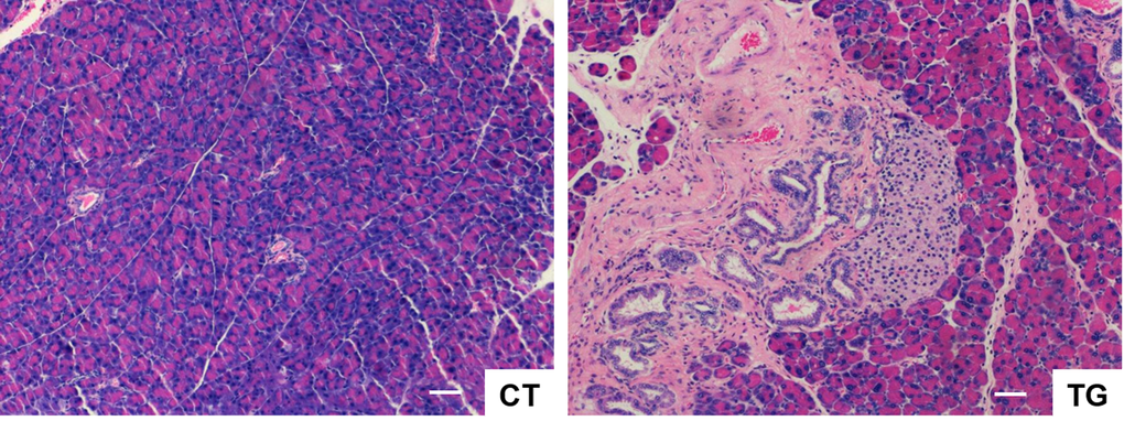 The incidence and severity of pancreatitis increases in elderly population [38-40]. Colby et al. [41] have shown that bovine keratin 5 promoter-driven expression of COX2 results in dysplastic changes in the pancreas. Consistent with their findings, pancreata of COX2 transgenic mice exhibited phenotypes similar to chronic pancreatitis such as the loss of the pancreatic acini, the increase of the metaplastic pancreatic ducts with dysplastic changes, peri-ductal fibrosis, and mononuclear inflammatory cell infiltration in the highly vascularized fibrotic stroma (Fig. 6). Hyperplasia of the Langerhans islets was also noticed, which is often associated with age in mice [42].