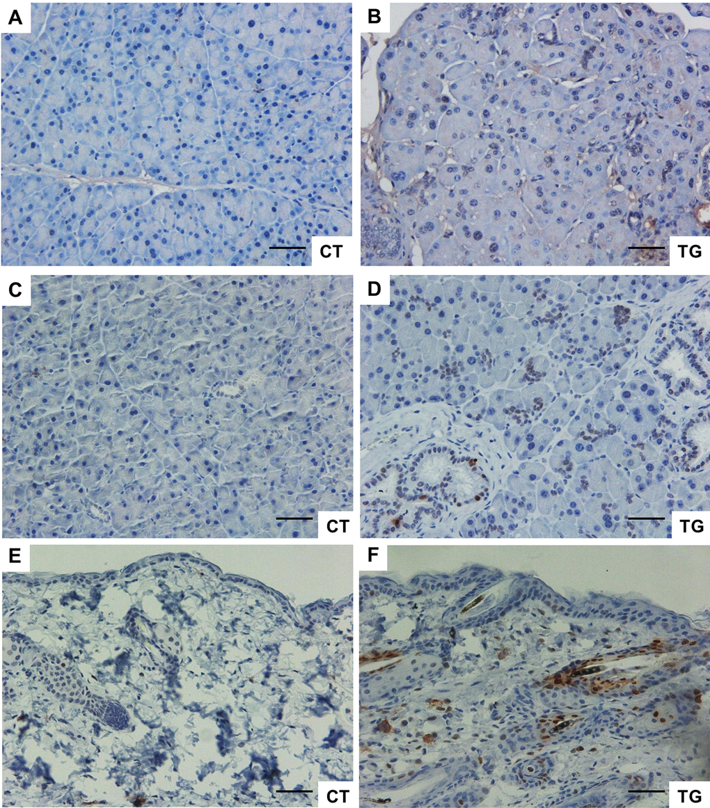 Cellular senescence has been proposed to contribute to aging phenotypes and/or the development of certain age-related diseases [43]. The number of senescent cells increases with age in mammalian tissues [44], and such cells have been found at sites of age-related pathologies such as osteoarthritis and atherosclerosis [45,46]. Immunohistochemical analysis of p16Ink4a, an indicator of senescence, revealed that the number of p16Ink4a-positive cells was increased in the pancreata of COX2 transgenic mice compared to that in pancreata of control littermates (Fig. 7A and B). In addition, immunohistochemical analysis of phospho-H2AX, a marker of DNA damage, showed that the number of phospho-H2AX-positive cells was increased in the pancreata of transgenic mice (Fig. 7C and D). Similarly, Western blot analysis showed increased levels of p16 and phospho-H2AX in transgenic pancreas (Supplementary Figure 1). Increase in the number of phospho-H2AX-positive cells was also observed in the skin of COX2 transgenic mice (Fig. 7E and F).