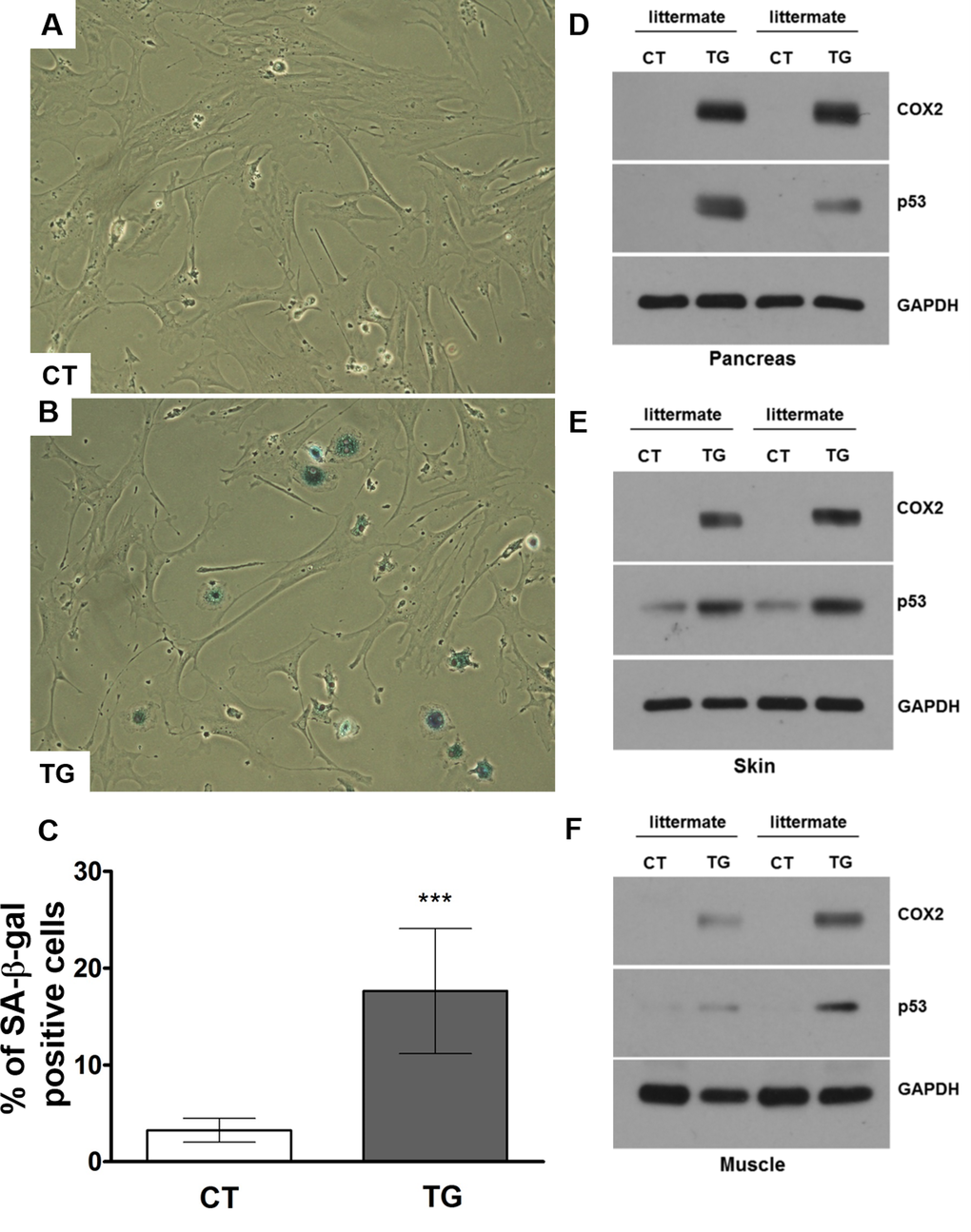 To determine whether increased COX2 expression is associated with the increased cellular senescence, we performed senescence-associated beta-galactosidase (SA-β-gal) staining using adult mouse lung fibroblasts isolated from control and COX2 transgenic mice. The isolated fibroblasts were incubated with 1 μM of 4-hydroxytamoxifen to induce COX2 expression. As shown in Fig. 8A-C, the number of SA-β-gal-positive cells was increased in COX2 transgenic fibroblasts compared to that in control fibroblasts. However, treatment of COX2 transgenic fibroblasts with NS-398, a COX2 specific inhibitor, significantly reduced the number of SA-β-gal-positive cells (Supplementary Figure 2A and B). We previously have shown the up-regulation of p53 levels in COX2 transgenic embryos [24]. Moreover, we recently have demonstrated that COX2 regulates DNA damage-induced expression of p53 through modulation of oxidative stress [47]. To examine whether p53 expression is altered in COX2 transgenic mice, we assessed the levels of p53 in the tissues of control and transgenic mice. Western blot analysis revealed that expression of p53 was increased in the tissue lysates of COX2 transgenic mice (Fig. 8D-F). These results suggest that premature aging phenotypes may be linked to COX2-mediated induction of cellular senescence.