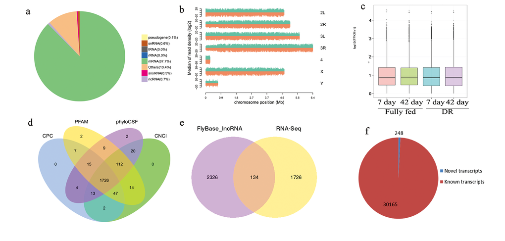 A total of 86.78 GB of raw sequence data was produced yielding 7.26 billion strand-specific raw reads (Table S1). Value of Q20, Q30 and GC content were not significantly different among samples. After quality check, 95.79% of clean reads were obtained and were aligned to the D. melanogaster genome from FlyBase (Dmel_Release_6, http://FlyBase.org/), assigning 87.7% reads to the mRNA sequences (Fig. 2a). The read density (log2) was distributed mainly in 2L, 2R, 3L, 3R and X chromosomes (Fig. 2b). FPKM (fragments per kilobase of transcript sequence per millions base pairs sequenced) distribution was not significantly different in expression levels between lncRNAs and mRNA in DR and fully fed flies (P≤0.05, Fig. 2c).