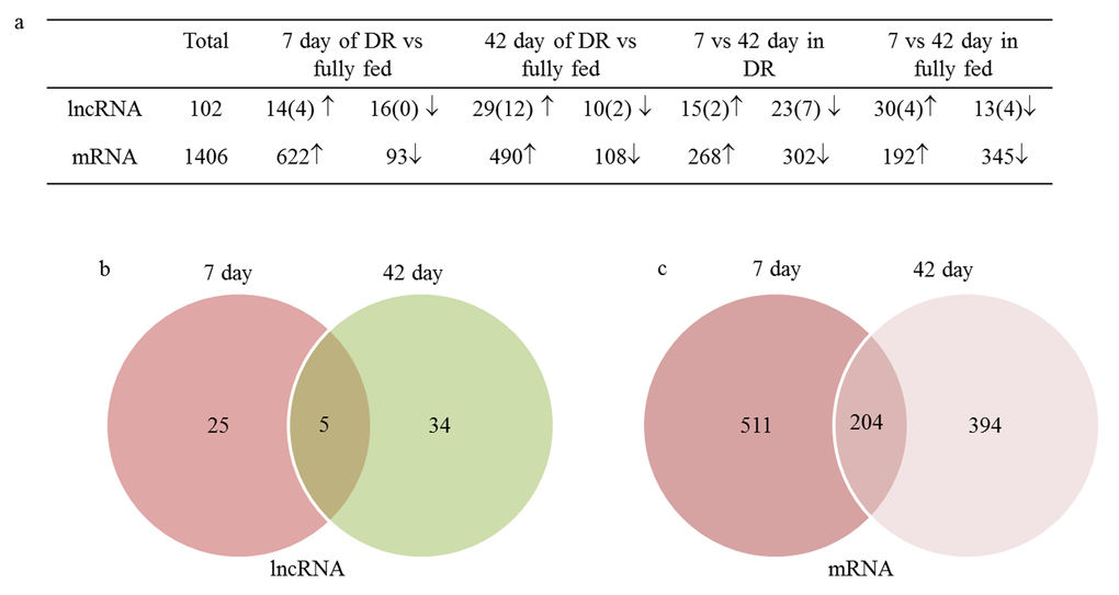 Differentially expressed genes (DEGs) had been analyzed between four comparative groups (Dataset S4), including 7 day DR vs 7 day fully fed, 42 day DR vs 42 day fully fed, 7 day DR vs 42 day DR, 7 day fully fed vs 42 day fully fed. In total, 102 differentially expressed lncRNAs (25 known and 77 novels) and 1406 coding genes were identified between these four comparative groups. A total of 719 differentially expressed transcripts were the most abundant as measured at 7 day between DR and fully fed group, including 30 lncRNAs and 689 coding mRNA genes. Also 39 differentially expressed lncRNAs and 571 differentially expressed coding genes were present at 42 day of DR when compared to fully fed group (Fig. 3a). Out of those differentially expressed transcripts, five common differentially expressed lncRNAs and 204 common coding genes appeared at both 7 day and 42 day between DR and fully fed groups (Fig. 3b, 3c). Among five differentially expressed lncRNAs, CR31781 and XLOC_014901 were up-regulated while XLOC_189941 was down-regulated in DR when compared to fully fed group at both time frames. Another two lncRNAs (XLOC_189909 and XLOC_228709) were down-regulated at 7 day and up-regulated at 42 day in DR when compared to fully fed group.
