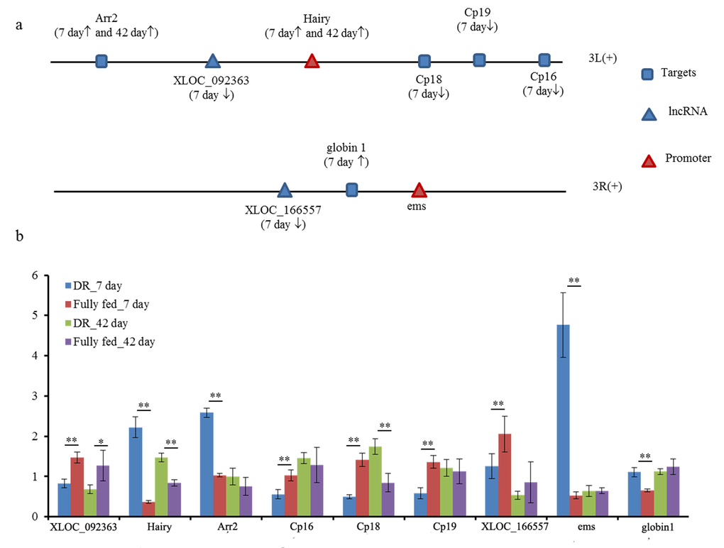 Interestingly enough, two novel lncRNAs (XLOC_092363 and XLOC_166557) differentially expressed at the 7 day in DR group when compared to fully fed group. lncRNA XLOC_092363 was located in promoter hairy in the up-stream of sense strand of 3L chromosome. Five differentially expressed targets of XLOC_092363 were also located in 3L chromosome through cis-acting mode (Fig. 4a). It’s noteworthy that hairy gene as associated promoter and as target of XLOC_092363, differentially expressed at 7 day and 42 day of DR in comparison to fully fed flies. Target arr2 has the same tendency of being differentially expressed with promoter hairy gene. Other three targets Cp16, Cp18 and Cp19 differentially expressed at the 7 day in DR when compared to fully fed group, and their molecular function was being the structural constituent of chorion. In addition, promoter ems sited in the down-stream of XLOC_166557 in sense strand of 3R chromosome is involved in heme binding and iron ion binding of GO annotations (Fig. 4a). The target of XLOC_166557 was globin 1 by cis-acting mode, and XLOC_166557 was found to be down-regulated while globin 1 was up-regulated in DR when compared to fully fed flies. The qPCR results were consistent with RNA-seq data up to certain extent (Dataset S3), and revealed differential expression between DR and fully fed flies (Fig. 4b).