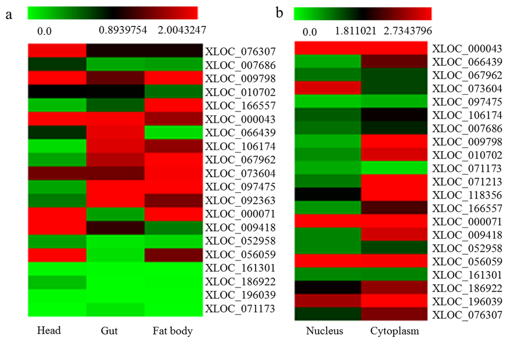 A total of 20 novel differentially expressed lncRNAs at 7 day under DR condition were randomly selected for analysis in fly head, gut, and fat body using qPCR to determine the tissue specificity (Fig. 5a, primers in Table S2). The results showed that lncRNA XLOC_066439 were at significantly higher expression level in gut compared to head and fat body (P≤0.05). Also the expression levels of XLOC_076307 and XLOC_009418 in head were significantly higher than that of gut and fat body (P≤0.05). XLOC_166557 was mainly expressed in fatbody of fruit flies. Tissue specificity of several lncRNA was consistent with their targets (Table S3), such as XLOC_076307 (Socs36E, head), XLOC_166557 (globin 1, fatbody), XLOC_067962 (PGRP-SC1a, PGRP-SC2 and CG8740, gut and fatbody). On the other hand, 21 differentially expressed lncRNAs were identified in cytoplasm or nucleus of Schneider’s line 2 cells by qPCR (Fig. 5b). Among these lncRNA, XLOC_073604 was specially expressed in S2 cell’s nucleus. LncRNA XLOC_009798, XLOC_010702, XLOC_071213, XLOC_118356, XLOC_009418 and XLOC_076307 were particularly located in S2 cell’s cytoplasm. We also found that lncRNA XLOC_000071, XLOC_056059 and XLOC_196039 were expressed in S2 cell’s nucleus and cytoplasm.