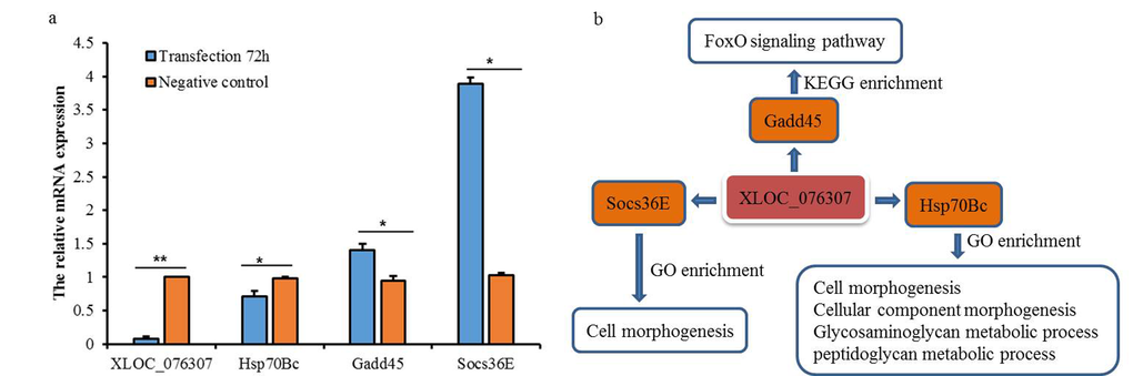 A novel lncRNA, targets among other few, the Gadd45 gene which is involved in FoxO signaling pathway (Fig. 6). In order to understand the role of this novel lncRNA XLOC_076307, we silenced it in fruit fly S2 cells by small interfering RNA (siRNA). The results showed that the expression level of XLOC_076307 and its target Hsp70Bc decreased significantly (P≤0.01), while targets Gadd45 and Socs36E showed significant increases after 72h of transfection, confirming the association between lncRNA and its predicted targets through trans action model.