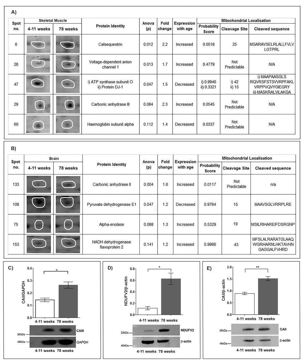 Mitochondrial samples, 4-11 weeks brain (n=5), 78 weeks brain (n=5), 4-11 weeks skeletal muscle (n=3) and 78 weeks skeletal muscle (n=3), were subject to iso-electric focussing using ZOOM IPG (Life Technologies) system and pH 3-10 (non-linear) ZOOM IPG strips following the manufacturers protocol. Gels were stained (SimplyBlue™ SafeStain, Life Technologies) and imaged (ImageQuant 300, GE Healthcare Life Sciences). Analysis was performed using SameSpots software (Totallab). Protein spots with a p value of less than 0.15 and a fold change greater than 1.2 were further analysed (one-way ANOVA). Proteins were identified from the gel pieces as described previously5.