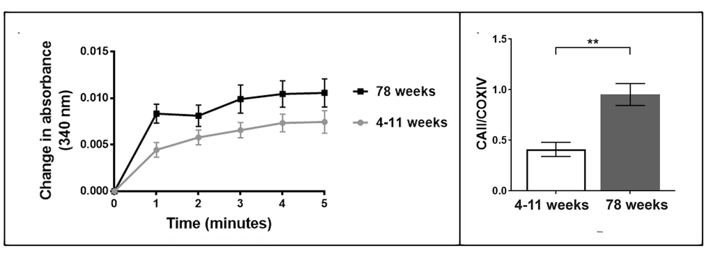 Esterase activity of carbonic anhydrase II was measured by monitoring the release of 4-nitrophenol at A348 nm in a Thermo Scientific Helios Epsilon spectrophotometer using standard methods [46]. Cuvettes contained 900 μl of 15 mM Tris Sulphate Buffer, pH 7.6 at 0°C (Sigma), 500 μl of 3 mM 4-nitrophenyl-acetate (Sigma) and 30 μg/μl of mitochondrial sample (3 mitochondrial preparations and 3 replicates for each condition, 4-11 weeks and 78 weeks). The rate of change in absorbance of the assay was plotted. Unpaired t-tests (GraphPad Prism) were carried out at each time point.