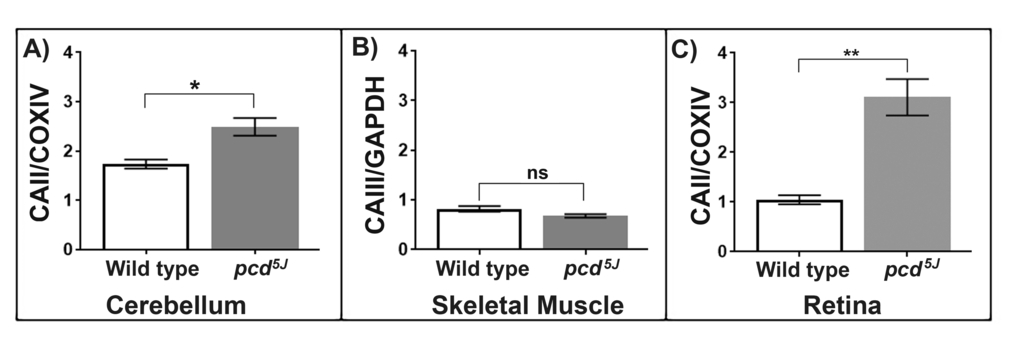 Skeletal muscle is unaffected by the loss of Nna1 function in pcd5J animals. The muscle specific isoform of carbonic anhydrase CAIII was found to be altered in the ageing skeletal muscle mitochondria. We wanted to test whether CAIII protein levels changed in the pcd5J mouse muscle to see whether the changes in CAII in neural tissues were indeed specific for ageing and neurodegeneration or whether the pcd5J mutant has a systemic alteration in carbonic anhydrases, even in unaffected tissues. We compared pcd5J skeletal muscle from the young mice that already showed signs of neurodegeneration in retina and cerebellum with age-matched wild type animals (10-13 weeks). We found that the quantity of CAIII is not significantly different in the pcd5J and wild type animals (Figure 3B). Since the pcd5J animals have functionally healthy skeletal muscle it is unsurprising that there is no significant difference between the quantity of CAIII in the wild type and mutant animals. However, this suggests very strongly that the alterations in carbonic anhydrases found in ageing and neurodegeneration are a harbinger of the dysfunction which ensues.