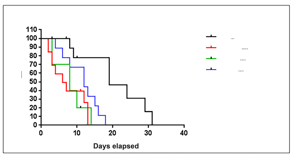 The six alpha-carbonic anhydrase isoforms 1 to 6 are encoded for in the Caenorhabditis elegans genome (cah-1, cah-2, cah-3, cah-4, cah-5 and cah-6) [44]. Wormbase searches revealed that the murine (Mus musculus) CAII gene has similar homology to the C.elegans gene cah-3. Both cah-3 and cah-4 in C.elegans are orthologs of the murine carbonic anhydrase II gene [45]. Ensemble searches showed that the amino acid sequence for the murine carbonic anhydrase II protein has sequence homology with four carbonic anhydrase proteins in C.elegans, cah-3, cah-5, cah-1 and cah-2. We tested whether the increase in CAII is a protective mechanism or a sign of dysfunction by exploring the effect of CAII on C. elegans. C. elegans (strain CB5600) were treated with three different concentrations of CAII (1500 units, 150 units and 15 units). Animals treated with CAII have a significant reduction in lifespan p=0.0006 (Log-rank test). The animals show a dose dependant response to increased levels of CAII (Figure 4). The median lifespans were 6, 8 and 12 days for animals treated with 1500 units, 150 units, 15 units respectively. In the same experiments control animals had a median lifespan of 19 days. The absolute maximum lifespans were 13, 14 and 18 days for animals treated with 1500 units, 150 units and 15 units respectively and the control animals had an absolute maximum lifespan of 31 days. Animals treated with the highest concentration of CAII (1500 units) had a 58% reduction in lifespan compared to the control animals, whilst animals treated with 150 and 15 units showed a reduction in lifespan by 55% and 42% respectively compared to the controls. Based on these findings we suggest that carbonic anhydrase inhibitors could be targeting the effects of mitochondrial ageing in neurons by reducing carbonic anhydrase levels to physiologically more youthful levels. CAII is likely to be an important regulator of the ageing process.
