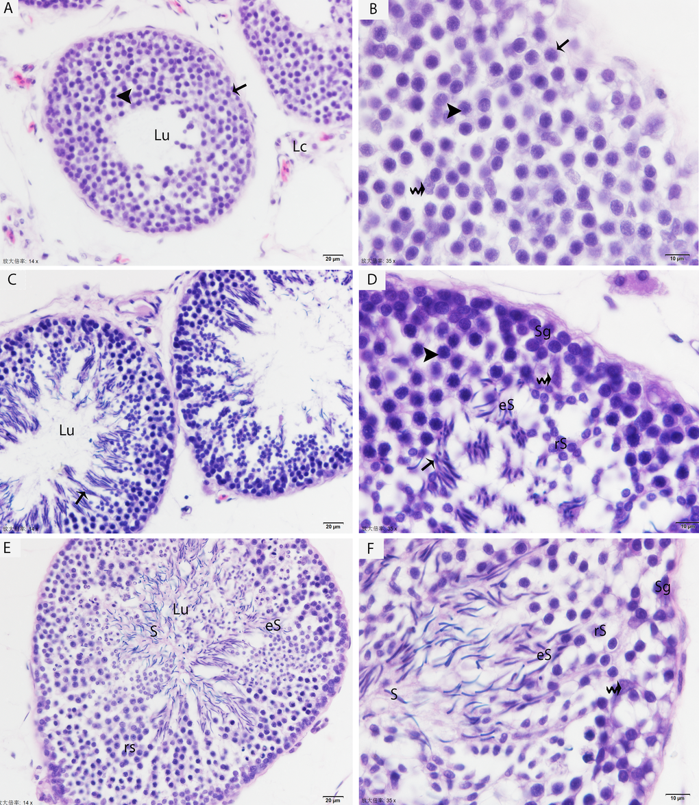 The testis of the Chinese soft-shelled turtle consisted of seminiferous tubules lined with developing germ cells and a permanent number of Sertoli cells. In May, the seminiferous epithelium contained numerous mitotic cells (proliferative spermatogonia) and a few early spermatocytes, which indicated an early stage of spermatogenesis (Figs. 1A, 1B). By July, pachytene spermatocytes were detected in the seminiferous epithelium. The majority of the germ cell population was meiotic cells (spermatocytes) with some round/elongated spermatids progressing through the early events of spermiogenesis. These differentiating spermatids were arranged in the sperm column within the pockets of the Sertoli cells, but the lumen of the seminiferous tubule remained clear (Figs. 1C, 1D). In October, the seminiferous epithelium was lined with numerous spermatids that were progressing into various phases of spermiogenesis, and the lumen was filled with free spermatozoa. The meiotic activity of the germinative epithelium was largely completed in the seminiferous tubules, and the meiotic cells were drastically reduced at this stage. Few resting spermatogonia and Sertoli cells were observed around the basal membrane (Figs. 1E, 1F).