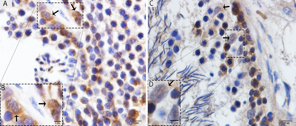 The immunohistochemical staining for LC3 was performed according to the manufacturer’s recommendations and as suggested in previous studies [42,43]. Testis specimen sections were processed using a standard immunohistochemistry protocol, as previously described [44]. Briefly, after deparaffinization, blocking endogenous peroxidase, microwave antigen retrieval, and BSA (Bull Serum Albumin) blocking, the primary antibody of rabbit polyclonal anti-LC3B (ab48394, Abcam, Cambridge, UK) was applied for 1 h at room temperature. After washing with PBS, the slides were incubated for 30 min with goat anti-rabbit-biotinylated antibody. The peroxidase was visualized with DAB, and sections were counter stained with hematoxyline. Sections incubated in PBS alone served as negative controls.