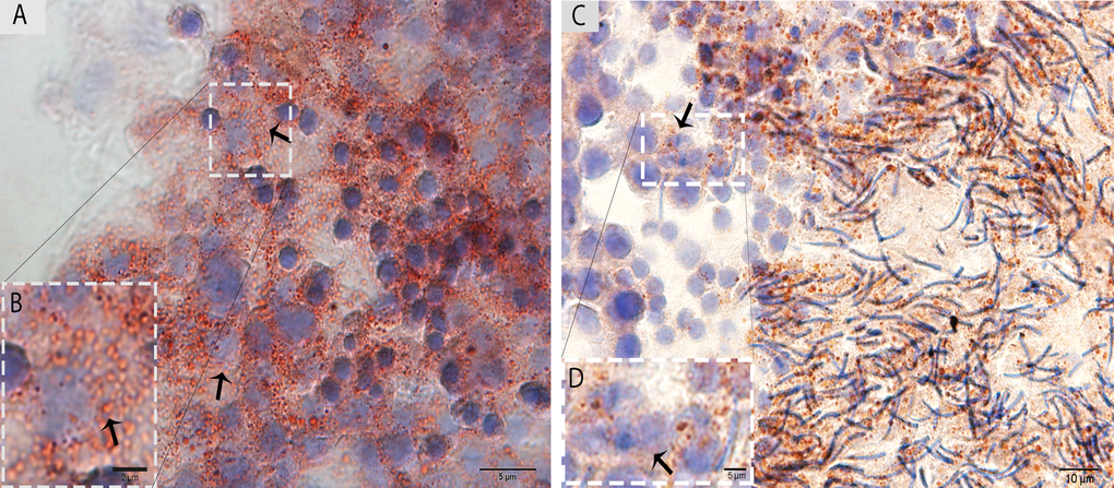 The ORO staining was performed in the testis for LD analysis in the Sertoli cells during spermatogenesis. The results indicate that a large number of LDs accumulated within the Sertoli cells in May. In contrast, few LDs were observed within the Sertoli cells in October, and more localization was observed around the elongated spermatids at this time (Fig. 3A, 3B).