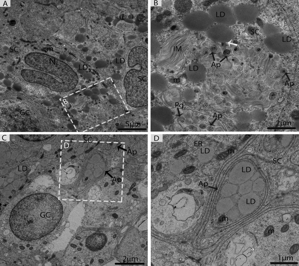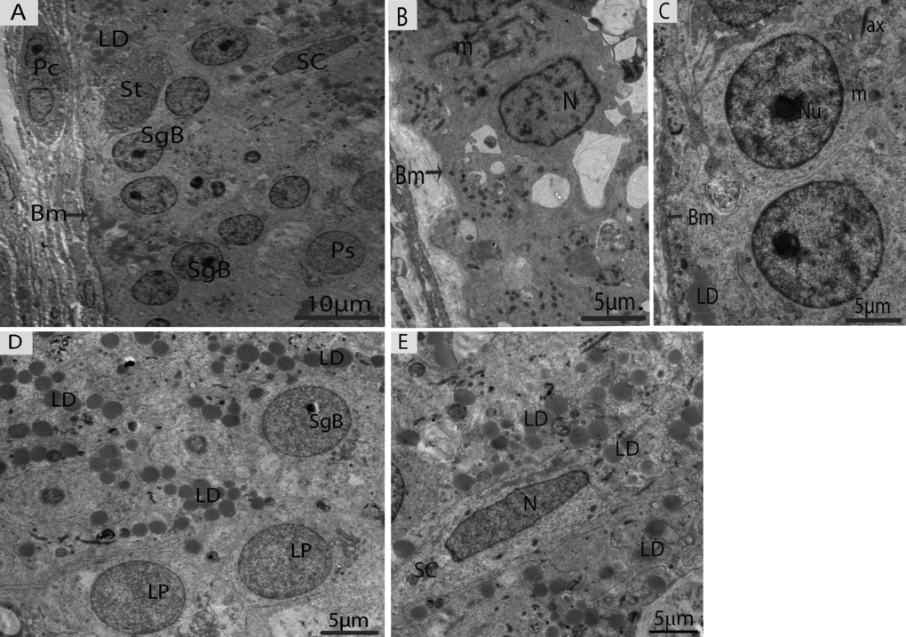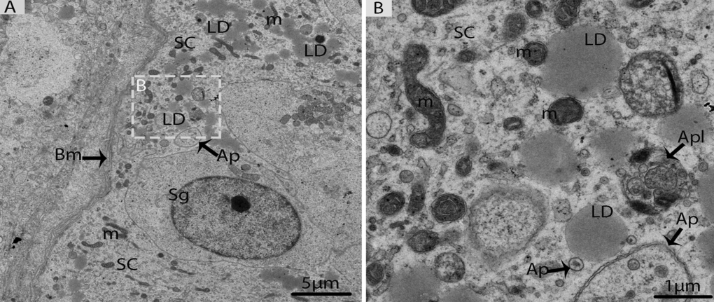Germ cells advance through development in association with Sertoli cells, which play a central role in the control of spermatogenesis. The key functions of Sertoli cells as reported in mammals, are providing structural support, phagocytosing degenerating germ cells, protecting the germ cells, releasing spermatids at spermiation and nourishing the developing germ cells [9,10]. Sertoli cells are also involved in the formation of LDs, the cytoplasmic stores of neutral lipids, but the existence of these lipid inclusions within Sertoli cells exhibits variation throughout spermatogenesis in rat testes [11]. The utilization of lipids is critical to maintain cellular energy homeostasis for different cellular processes. During nutrient scarcity, cellular lipids stored as triglycerides in LDs are hydrolyzed into fatty acids for energy. Previous studies have found that the formation of LDs is associated with the process of the phagocytosis of residual bodies or apoptotic cells within Sertoli cells, which was detected by Oil Red O staining [12]. Recently, autophagy has also been implicated in neutral lipid utilization from droplets under starvation conditions in mouse hepatocytes [13].