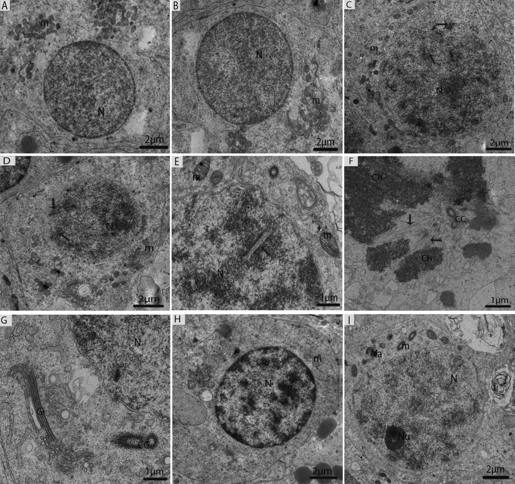 Type-B spermatogonia undergo mitotic divisions to produce primary spermatocytes (pre-leptotene), which are characterized by increasing nuclear and cytoplasmic size and the gradual condensation of nuclear chromatin into distinct chromosomes. Pre-leptotene spermatocytes contained a round nucleus and numerous mitochondria accumulated in one place (Fig. 6A). In contrast, leptotene spermatocytes appeared slightly larger than the pre-leptotene spermatocytes, and their nuclei contain fine filamentous chromatin fibers (Fig. 6B). The zygotene spermatocytes were noted by an increase in the thickening of the filamentous chromatin fibers within the nucleus and the synaptonemal complexes that started to appear (Fig. 6C). Pachytene spermatocytes contained well-developed synaptonemal complexes, which connected the homologous chromosomes during the first meiotic divisions. Thicker and dense chromosomes were attached with spindle fibers along with the centriole and the Golgi complexes that were found close to the centrosome (Figs. 6D, 6E, 6F, 6G). The diplotene spermatocytes appeared with thick fully condensed chromosomal fibers that were interspersed with large open areas of nucleoplasm (Fig. 6H). Meiosis I progressed to produce secondary spermatocytes, which appeared with nuclei along with nucleolus. There were few nuages that developed, and vacuolated mitochondria were observed in the secondary spermatocytes (Fig. 6I).