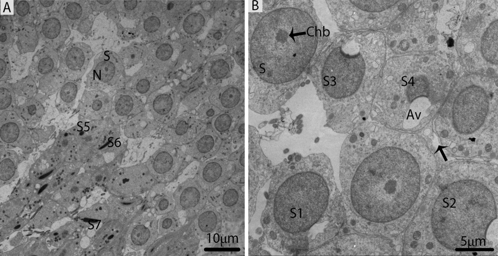 Spermatogenesis is a complex process of male gamete production with successive cellular differentiation that occurs with the support of the Sertoli cells. This process consists of the proliferation of progenitor cells (spermatogonial mitosis), which undergo reduction divisions, segregation and recombination of genetic material, known as spermatocytic meiosis, and maturational or spermiogenic phases, which are the final aspect of spermatogenesis [1,2]. Once the population of germ cells has reached maturation, spermiation consequently occurs, and the germ cells are released as spermatozoa from the seminiferous epithelium within the testes of vertebrates [3-5]. Few studies have described the major steps of spermatogenesis (light and electron microscopy) in more than several species of reptilian taxon, such as the Ophidia (snakes), the temperate lizard (Podarcis muralis) and the turtle (Trachemys scripta), but even in these studies, the ultrastructure is mainly focused on spermiogenesis and the mature spermatozoon. The ultrastructure of the early stages of spermatogenesis has not been well explored in Reptilia [3,6,7], and the ultrastructure of spermatogenesis within the Chinese soft-shelled turtle, Pelodiscus sinensis, has not yet been reported, although its spermiogenesis has been observed [8].