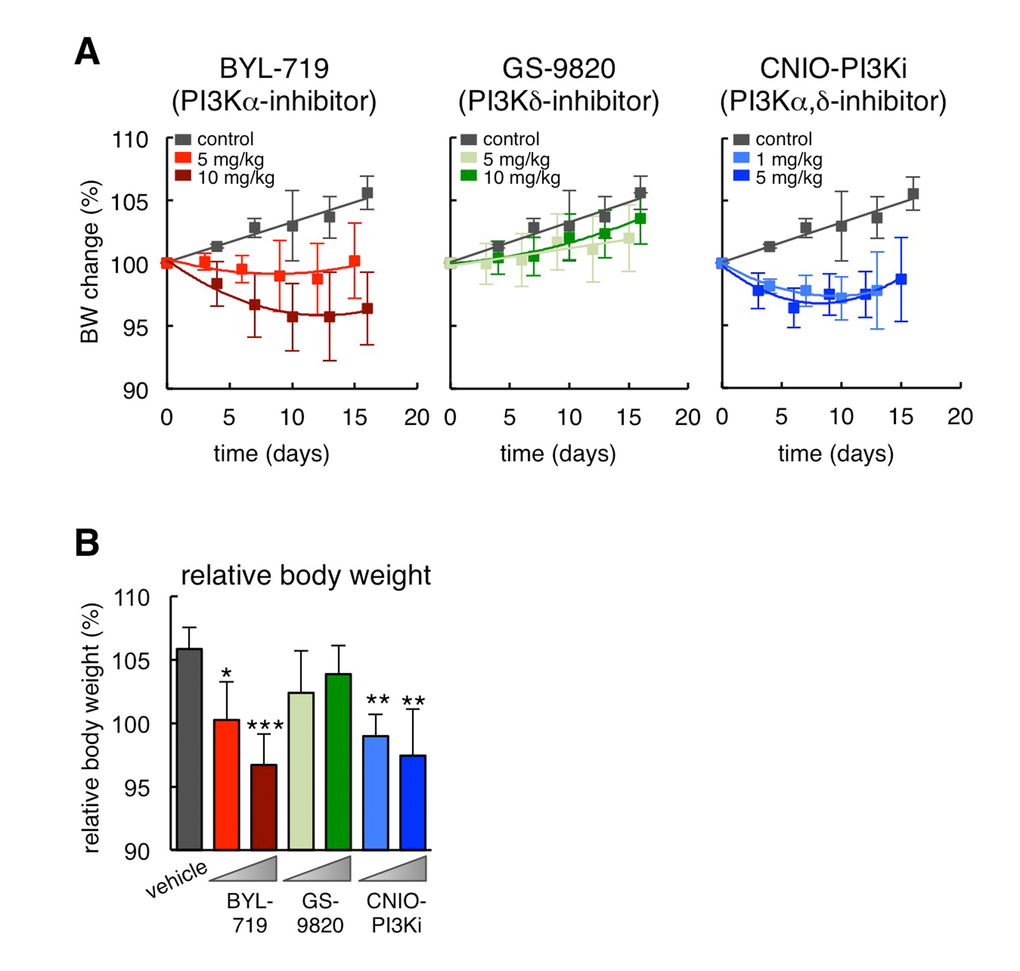 Previous work by us has shown that a dual PI3Kα and PI3Kδ inhibitor, namely CNIO-PI3Ki, reduces obesity and elevates energy expenditure in mice. Here, we have used selective inhibitors of PI3Kα and PI3Kδ and we have concluded that PI3Kα is the main isoform responsible for these beneficial metabolic effects. These observations are in agreement with the reported protection against aging-associated obesity of mice with reduced expression of PI3Kα [4]. It should be noted that CNIO-PI3Ki seems more efficient that BYL-719 in reducing obesity. Although the differential efficacy of the two inhibitors can have several explanations, one possibility is that PI3Kδ inhibition, although not sufficient by itself, contributes to reduce obesity in the context of simultaneous PI3Kα inhibition.