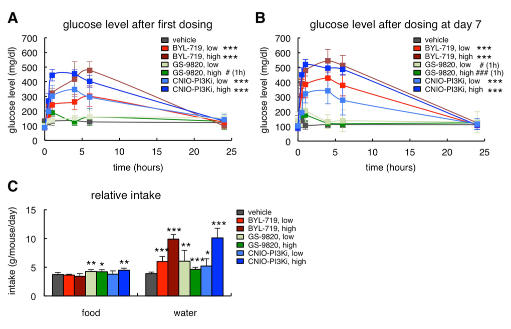 Inhibition of insulin signaling not only affects glucose homeostasis but also lipid metabolism. Therefore, another anticipated on-target effect of PI3Kα inhibition in the white adipose tissue is a reduction in the uptake of dietary triglycerides (TG) and an increase in lipolysis that results in elevated serum free fatty acids (FFA) [16,17]. These effects are recapitulated by treatment with rapamycin, which inhibits mTOR, a key downstream effector of PI3K [18]. In agreement with this, mice treated for 15 days with BYL-719 or CNIO-PI3Ki presented increased serum TG (Figure 3A) and FFA (Figure 3B), while GS-9820 had no detectable effect on serum lipids.