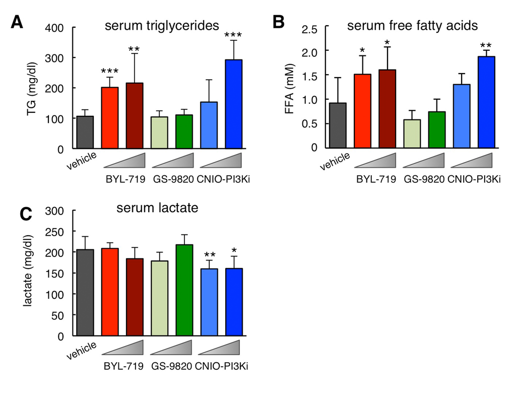 Partial down-modulation of PI3K has been reported to reduce serum lactate levels due to increased mitochondrial oxidative phosphorylation [19] and this effect has also been observed upon treatment with rapamycin [20]. Interestingly, mice treated for 15 days with 1 mg/kg CNIO-PI3Ki had a significant reduction in serum lactate, whereas this was not observed with BYL-719 or with GS-9820 at 10 mg/kg (Figure 3C). All together, we validate that BYL-719 and CNIO-PI3Ki are inhibiting PI3Kα in vivo by using a number of on-target readouts (hyperglycemia, increased serum lipids, and reduced serum lactate), whereas these effects are absent upon treatment with GS-9820.