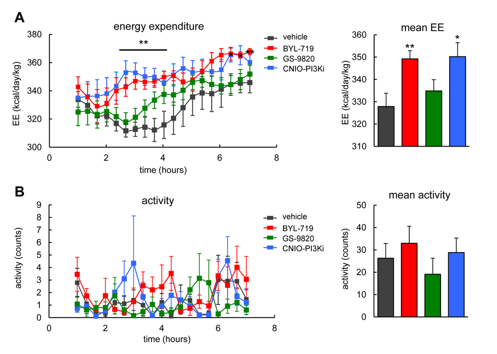 The PI3K pathway is a major inducer of anabolism and, therefore, genetic down-modulation of PI3K by PTEN or treatment of mice with CNIO-PI3Ki elevates energy expenditure [19,21]. We used lean wild-type mice to test the effect of a single dose (15 mg/kg) of each of the three PI3K inhibitors on energy expenditure. Interestingly, BYL-719, but not GS-9820, elevated energy expenditure during 7 h after oral administration in a similar way as CNIO-PI3Ki (Figure 4A). No changes in locomotor activity were observed in any of the treated mice (Figure 4B). Normal locomotor activity suggests the absence of severe toxic effects, and also excludes the possibility that increased physical activity could be the underlying reason for the increased energy expenditure. We conclude that PI3Kα, but not PI3Kδ, regulates energy expenditure in mice.