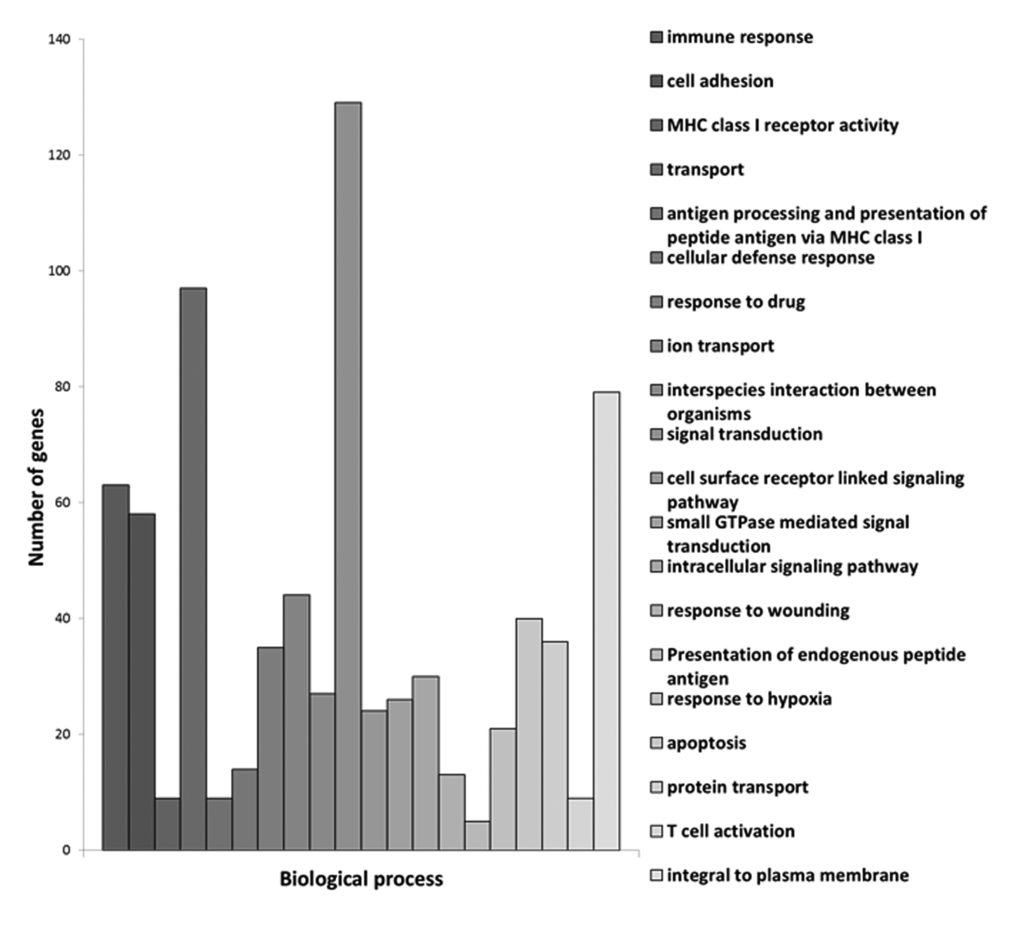 Furthermore, we identified 1721 genes that were characteristic of centenarians because they were differentially expressed when compared with septuagenarians and young people (Supplementary Fig. 1b). We have grouped those genes in terms of biological processes. These are shown in Figure 1. In this Figure, in the Y axis we show the number of genes involved and in the X axis the biological processes implicated. We have grouped these processes in terms of a p value with the highest p values shown on the left side of the figure. Therefore, the highest p value that we observed is the immune response followed by cell adhesion, and major histocompatibility complex class 1 receptor activity, transport processes, etc.